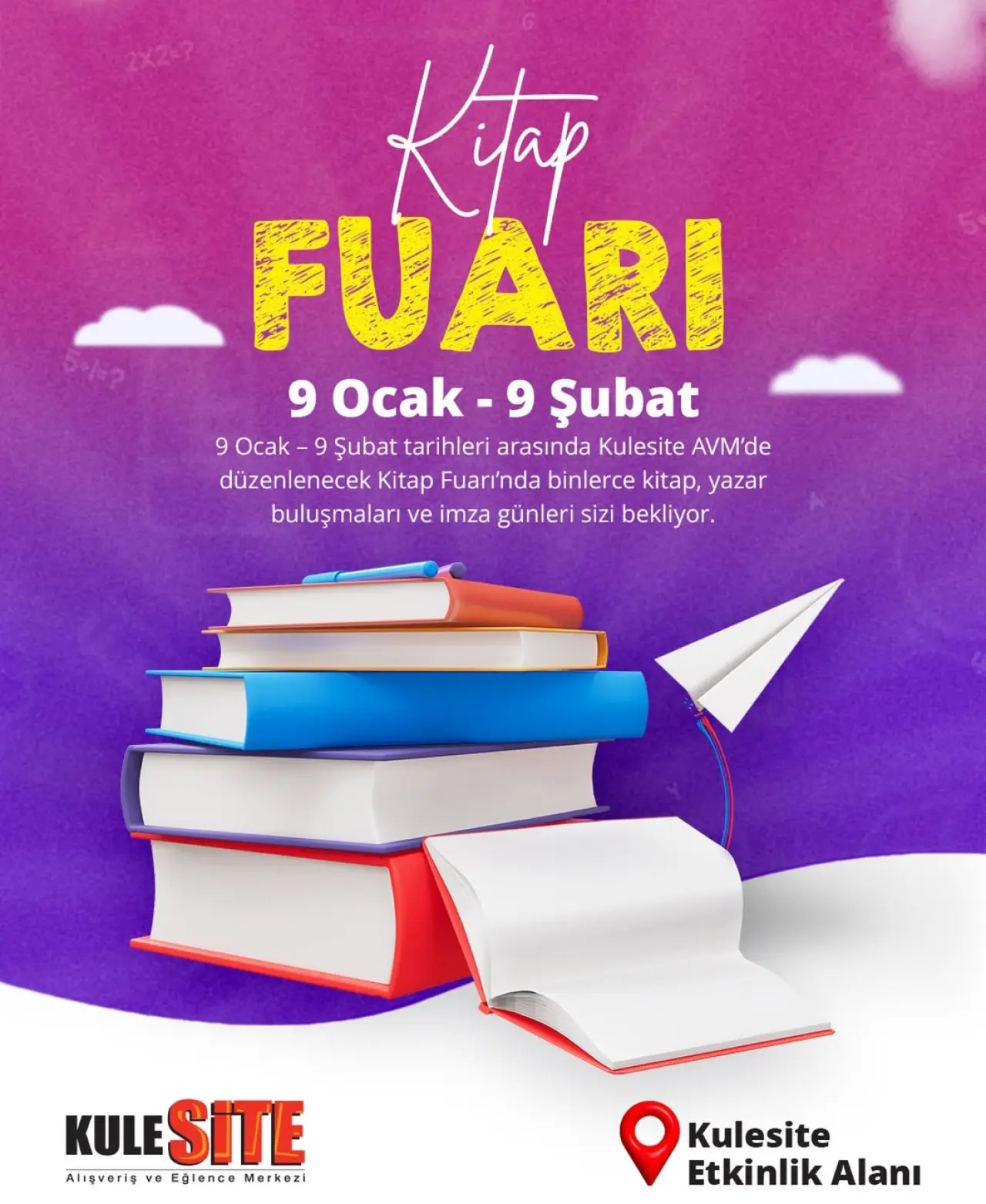 9 Ocak – 9 Şubat tarihleri arasında Kule Site AVM’de kitap severleri heyecanlandıracak bir etkinlik düzenleniyor. Fuar kapsamında birçok yazar, okurlarıyla bir araya gelerek imza günleri gerçekleştirecek.