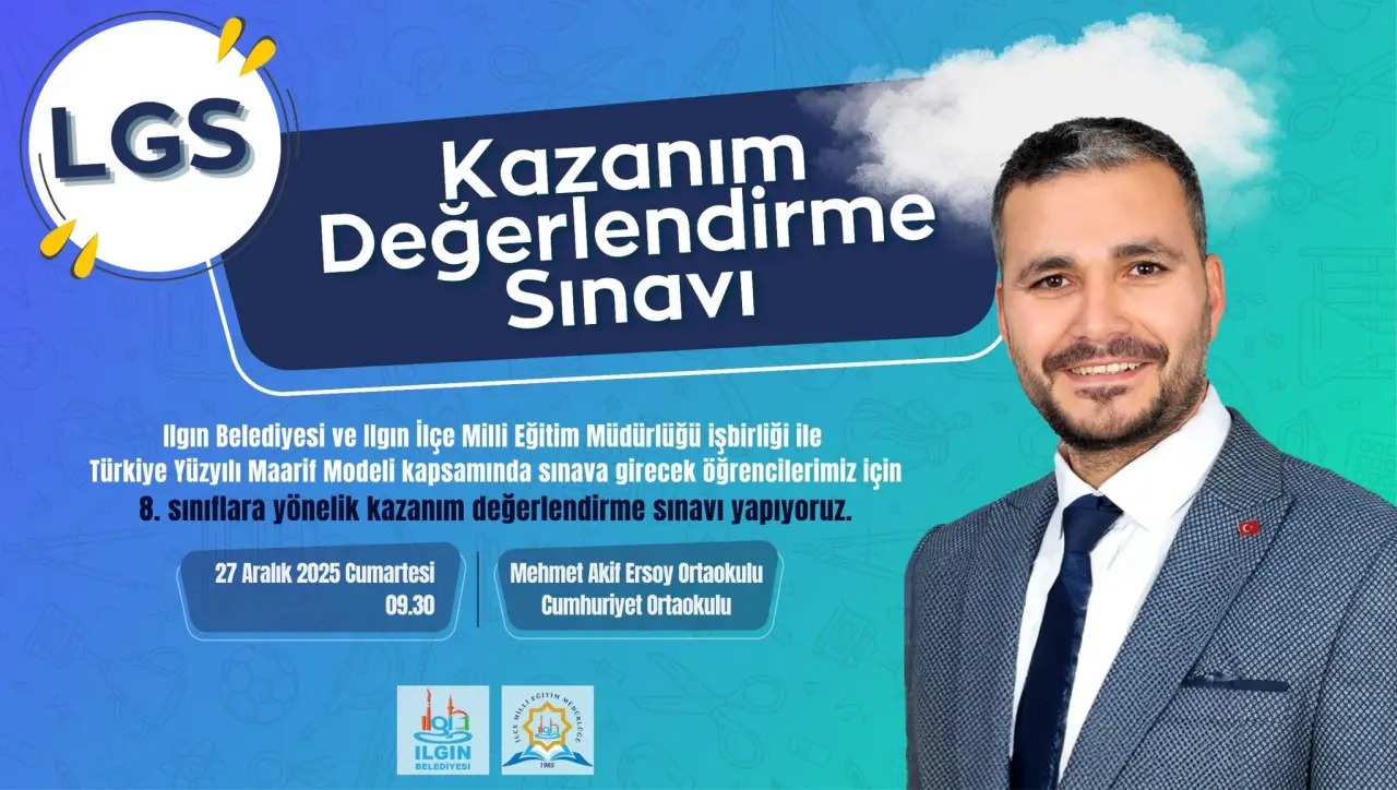 Ilgın Belediyesi ile Ilgın İlçe Milli Eğitim Müdürlüğü iş birliğinde, Türkiye Yüzyılı Maarif Modeli kapsamında sınava girecek öğrenciler için 8. sınıflara yönelik kazanım değerlendirme sınavı düzenleniyor. Öğrencilerin akademik kazanımlarını ölçmeyi ve sınav sürecine hazırlıklarını desteklemeyi amaçlayan sınav, 27 Aralık 2025 Cumartesi günü saat 09.30’da gerçekleştirilecek.