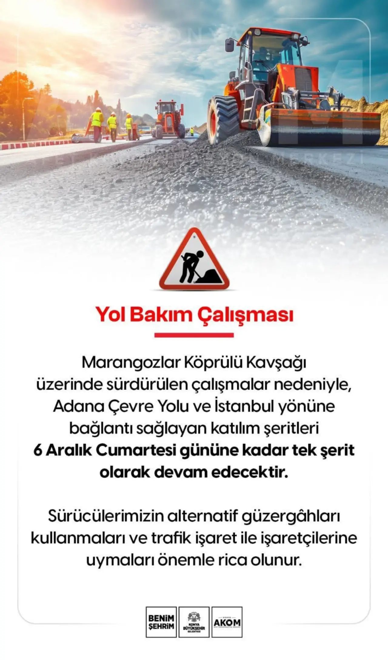 Konya Büyükşehir Belediyesi AKOM, Marangozlar Köprülü Kavşağı üzerinde devam eden çalışmalar nedeniyle trafik akışında geçici düzenlemeye gidildiğini duyurdu.