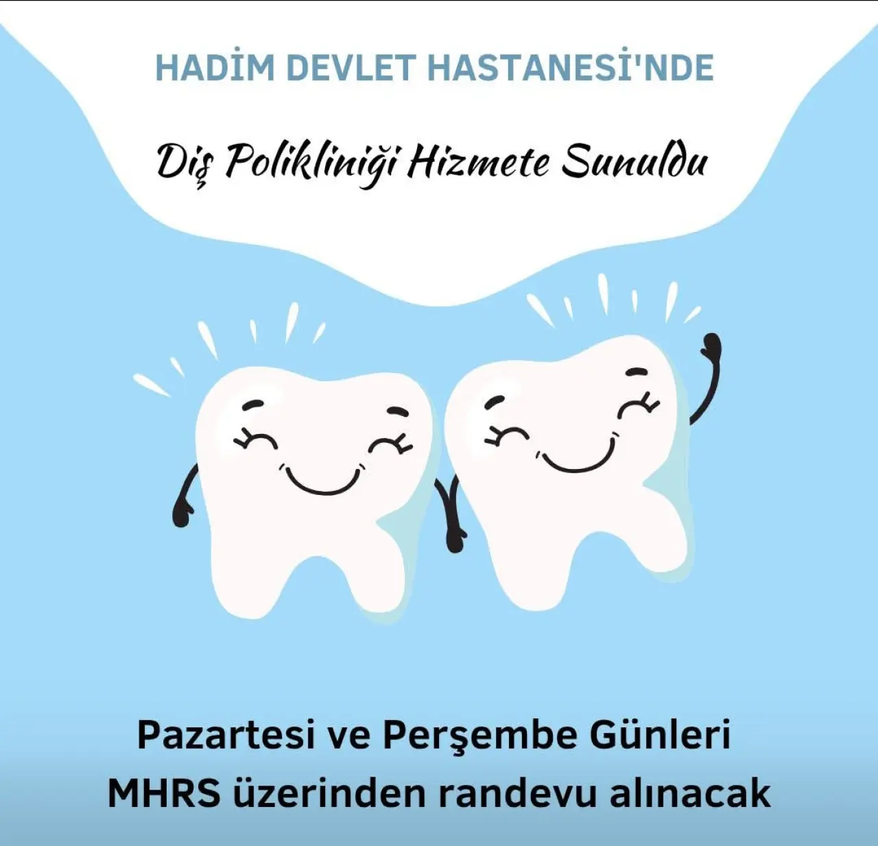 Açıklamada, Pazartesi ve Perşembe günleri Diş Hekimi Dt. Şule Çevik’in hasta kabul edeceği belirtilirken, muayene olmak isteyen vatandaşların MHRS sistemi üzerinden randevu oluşturmaları gerektiği ifade edildi.