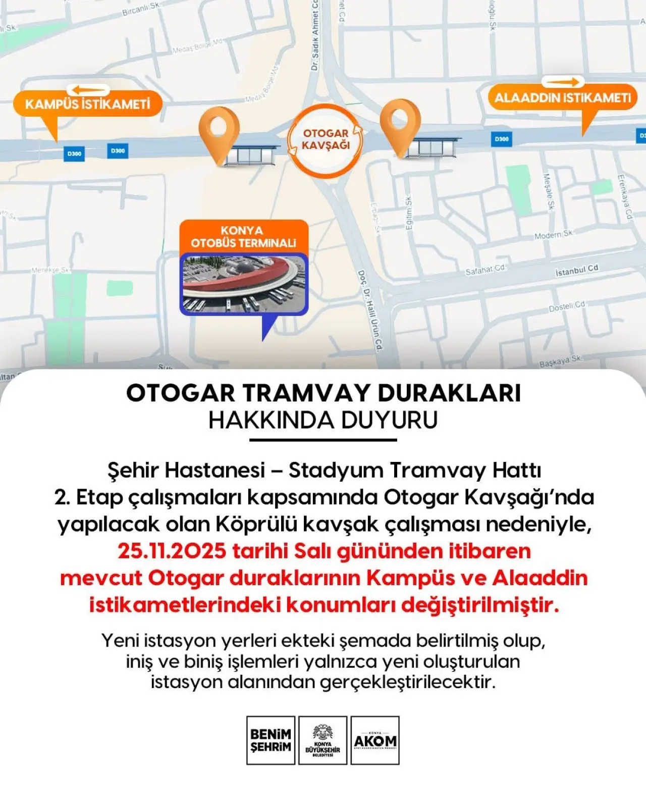 Otogar Kavşağı’nda inşa edilecek köprülü kavşak nedeniyle, 25 Kasım Salı gününden itibaren Otogar tramvay duraklarının her iki yöndeki konumları geçici olarak değiştirildi. Vatandaşların iniş–biniş işlemleri yalnızca belirlenen yeni durak alanlarından yapılacak.