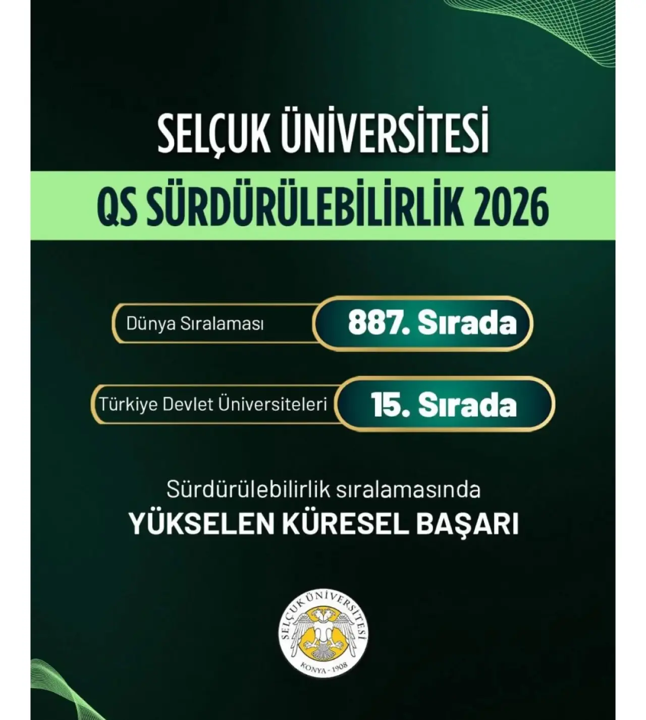 Üniversite, QS Dünya Üniversite Sıralaması: Sürdürülebilirlik 2026 sonuçlarında önemli bir başarıya imza attı. Dünyadaki 2001 üniversite arasında 887. sıraya, Türkiye’deki devlet üniversiteleri arasında ise 15. sıraya yerleşen Selçuk Üniversitesi, çevresel etki, sosyal etki ve yönetişim başlıklarında sergilediği performansla sürdürülebilirlik odaklı çalışmalarının karşılığını aldı. Üniversite, sürdürülebilir kalkınma hedefleriyle uyumlu eğitim, araştırma ve yönetim anlayışını güçlendirerek çevresel ve toplumsal sorumluluklarını daha da ileri taşıdı.