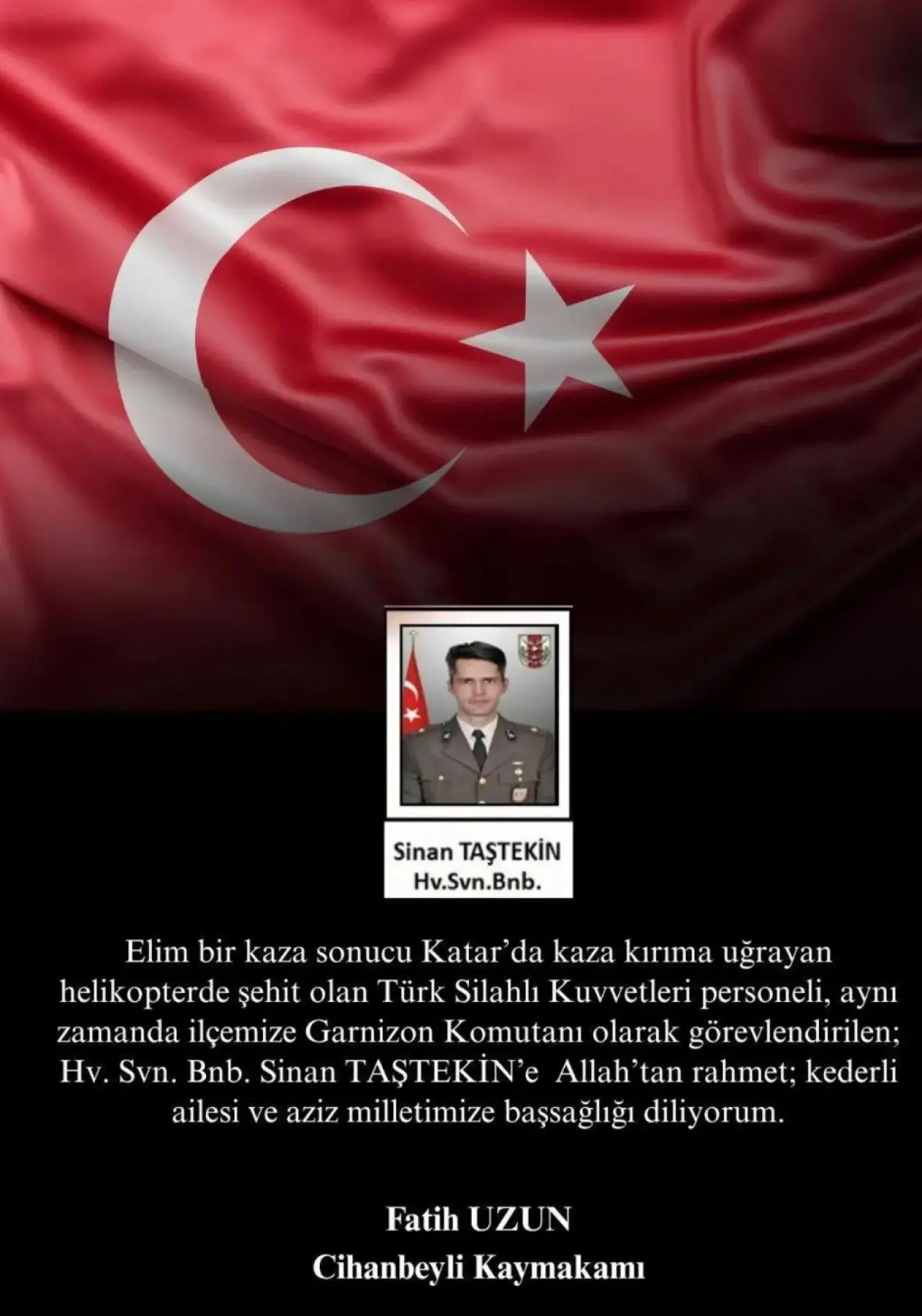 "Elim bir kaza sonucu Katar’da kaza kırıma uğrayan helikopterde şehit olan Türk Silahlı Kuvvetleri personeli, aynı zamanda ilçemize Garnizon Komutanı olarak görev yapan Hv. Svn. Bnb. Sinan Taştekin’e Allah’tan rahmet; kederli ailesi ve aziz milletimize başsağlığı diliyorum."