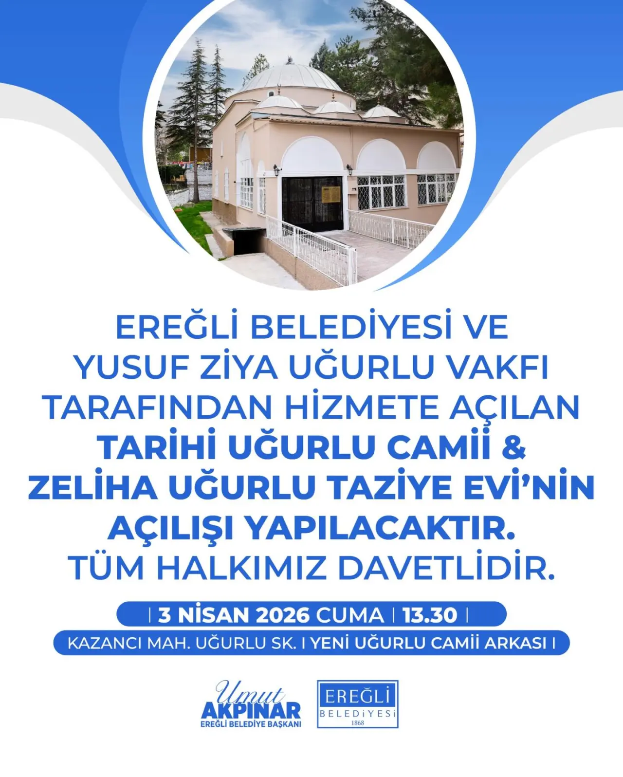 Ereğli Belediyesi ve Yusuf Ziya Uğurlu Vakfı iş birliğiyle hizmete açılan Tarihi Uğurlu Camii & Zeliha Uğurlu Taziye Evi için açılış töreni düzenlenecek.