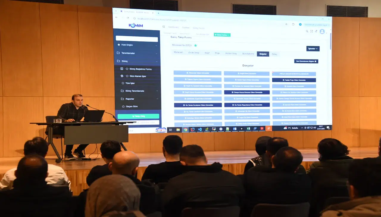 KOSKİ bünyesinde görev yapan tüm birimlerin sorumlu personellerinin katıldığı eğitimde, KOSKİ’nin kendi öz kaynakları ve kurum mühendisleri tarafından tamamen yerli olarak geliştirilen KOMİM yazılımının genel yapısı, modülleri ve kurum işleyişine sağladığı katkılar ayrıntılı şekilde ele alındı.