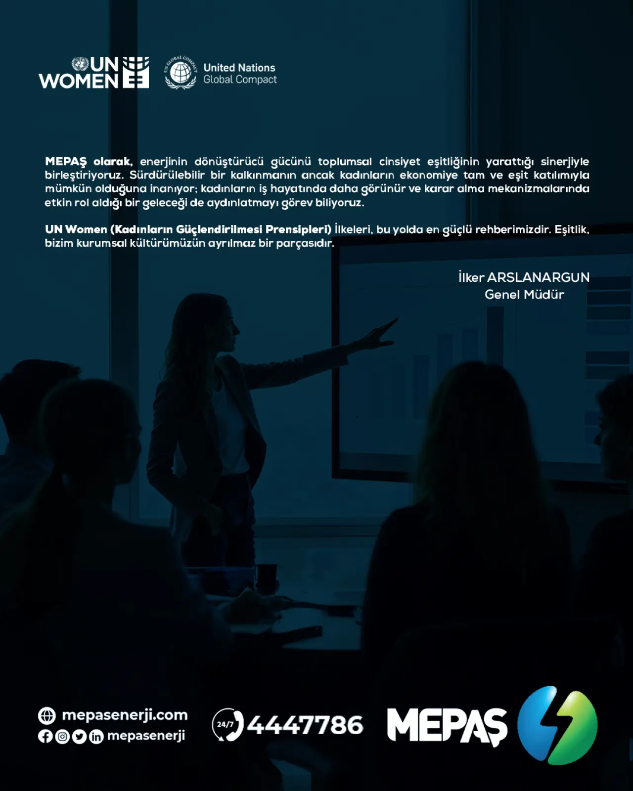 MEPAŞ Genel Müdürü İlker ARSLANARGUN ’un yaptığı açıklamada, enerji sektörünün dönüştürücü gücünün toplumsal eşitlikle birleştiğinde çok daha güçlü bir etki yaratacağını vurguladı. Genel Müdür açıklamasında: “MEPAŞ olarak enerjinin dönüştürücü gücünü, toplumsal cinsiyet eşitliğinin yarattığı sinerjiyle birleştiriyoruz. Sürdürülebilir kalkınmanın ancak kadınların ekonomiye tam ve eşit katılımıyla mümkün olduğuna inanıyoruz. Kadınların iş hayatında daha görünür olduğu, karar alma mekanizmalarında etkin rol aldığı bir geleceği aydınlatmayı görev biliyoruz. UN Women tarafından ortaya konan Kadının Güçlenmesi Prensipleri bu yolculukta en güçlü rehberlerimizden biridir. Eşitlik, bizim için yalnızca bir hedef değil; kurumsal kültürümüzün ayrılmaz bir parçasıdır.” ifadelerini kullandı