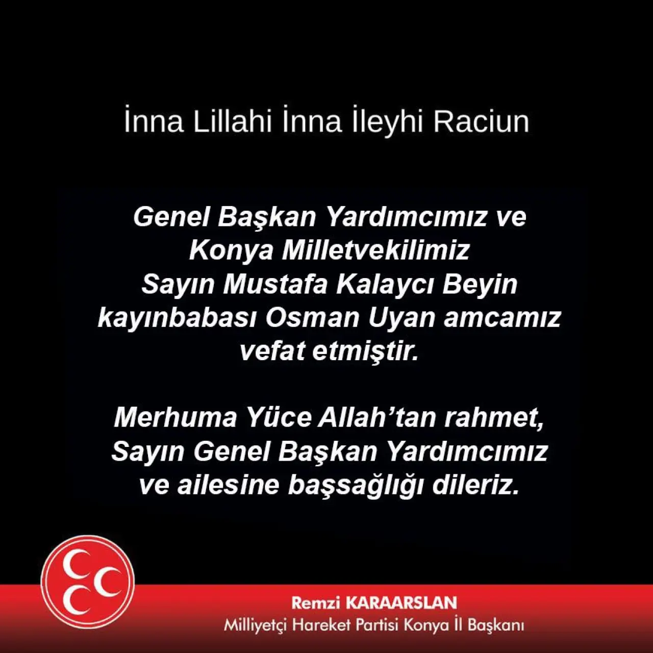 Milliyetçi Hareket Partisi Konya İl Başkanlığı tarafından yapılan paylaşımda, merhum Osman Uyan’a Yüce Allah’tan rahmet dilenirken, Genel Başkan Yardımcısı Mustafa Kalaycı başta olmak üzere ailesine ve yakınlarına başsağlığı temennisinde bulunuldu.