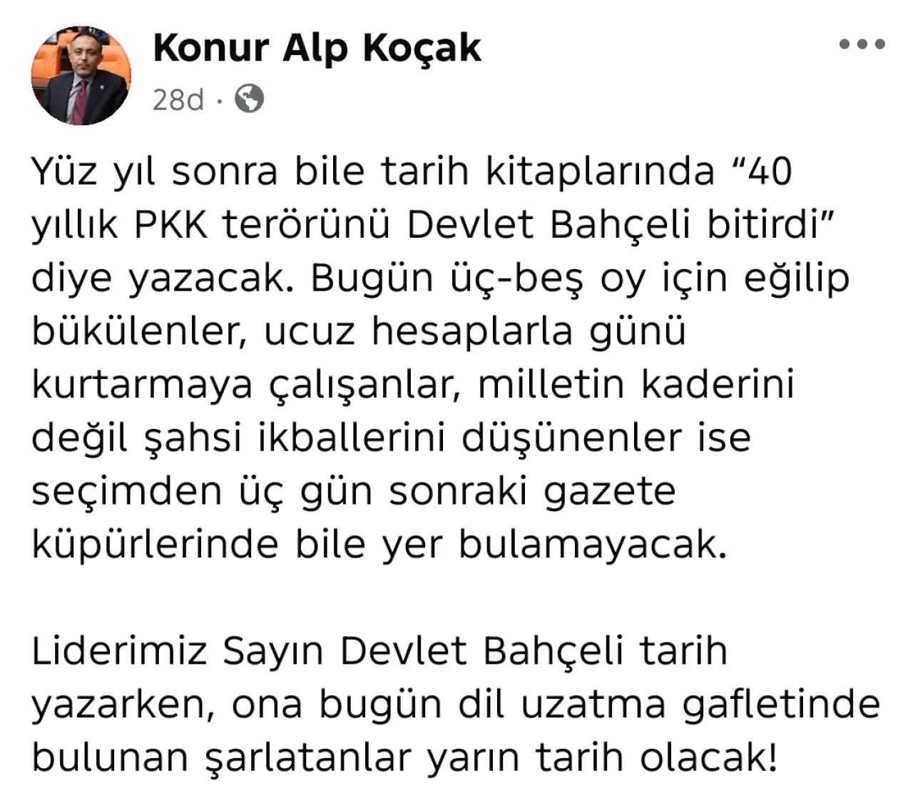 MHP Konya Milletvekili Konur Alp Koçak, sosyal medya hesabından yaptığı dikkat çeken paylaşımda terörle mücadeleye ve MHP Lideri Devlet Bahçeli’nin duruşuna ilişkin güçlü ifadeler kullandı. Koçak, “Yüz yıl sonra bile tarih kitaplarında ‘40 yıllık PKK terörünü Devlet Bahçeli bitirdi’ diye yazacak” sözleriyle, Bahçeli’nin terörle mücadeledeki kararlılığının tarihe geçeceğini vurguladı.