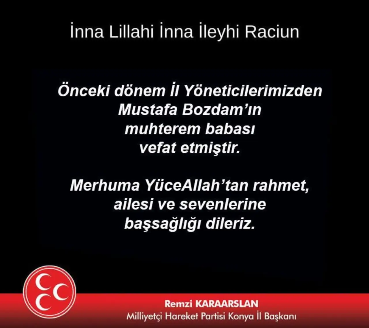 Milliyetçi Hareket Partisi Konya İl Başkanlığı, önceki dönem il yöneticilerinden Mustafa Bozdam’ın babasının vefat ettiğini duyurdu. Merhumun vefatı, parti teşkilatı ve sevenleri arasında üzüntüyle karşılandı.