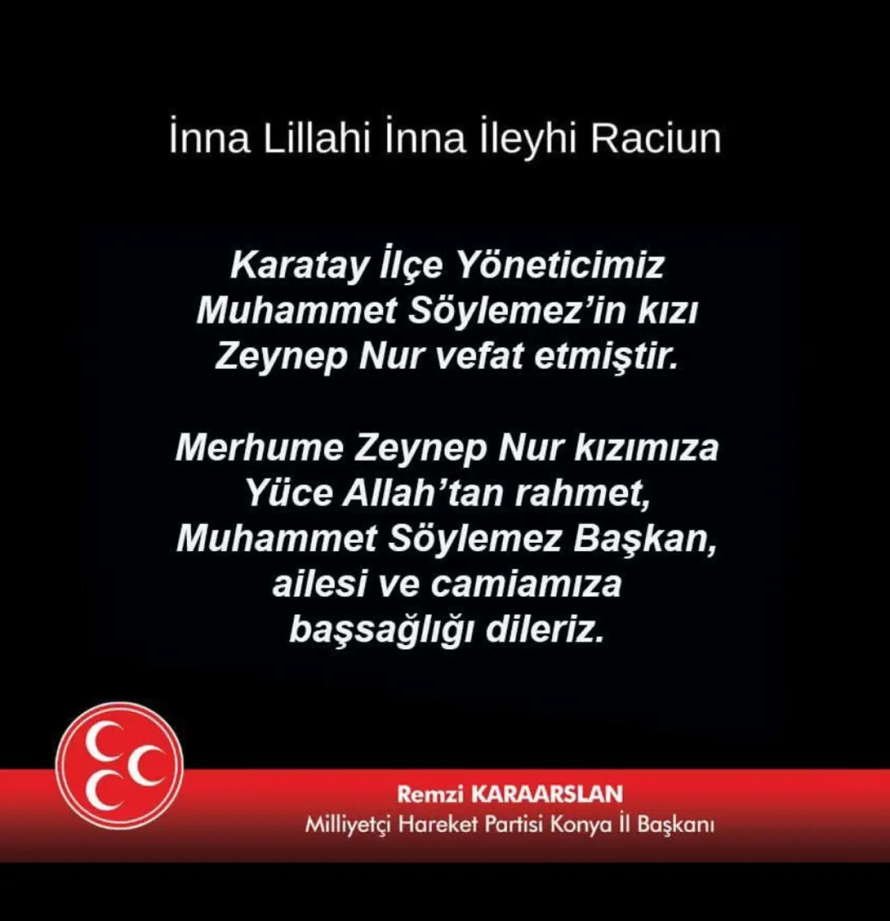 Milliyetçi Hareket Partisi Konya İl Başkanlığı, Karatay İlçe Yöneticisi Muhammet Söylemez’in kızı Zeynep Nur’un vefat ettiğini duyurdu.