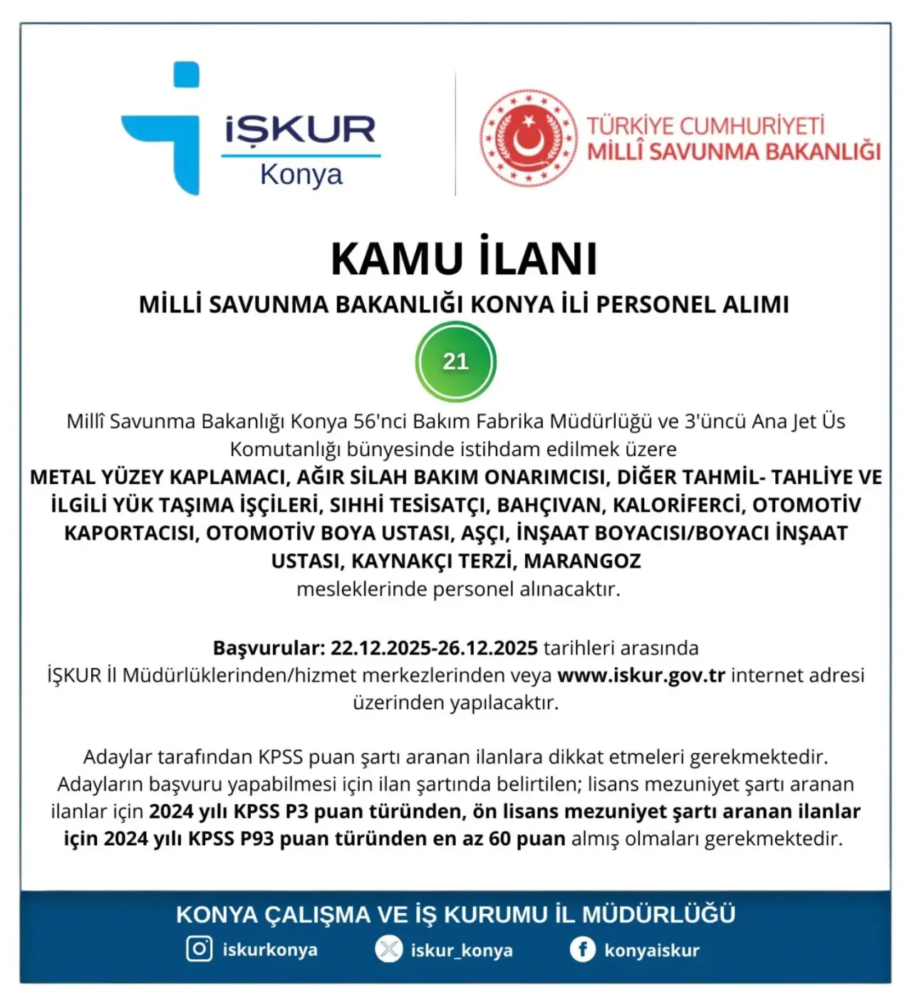 Milli Savunma Bakanlığı (MSB), Konya ilinde istihdam edilmek üzere personel alımı gerçekleştireceğini duyurdu. Kamu iş ilanı kapsamında yapılacak alımlar için başvuru süreci 22 Aralık 2025 – 26 Aralık 2025 tarihleri arasında olacak.