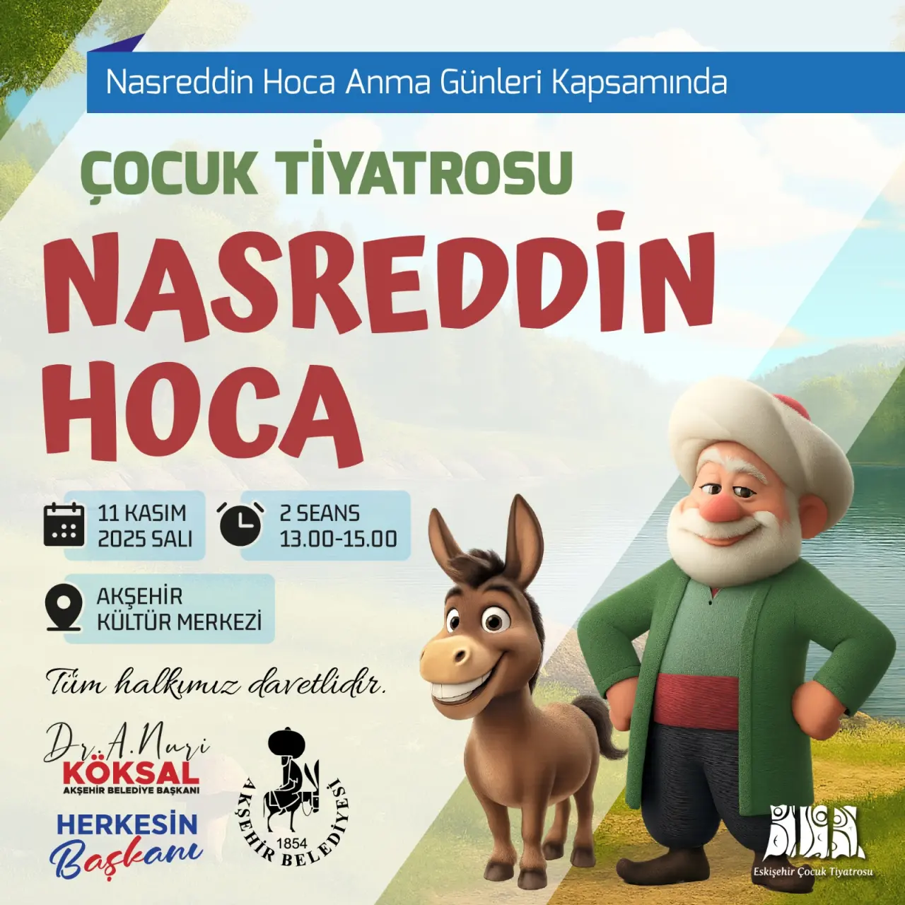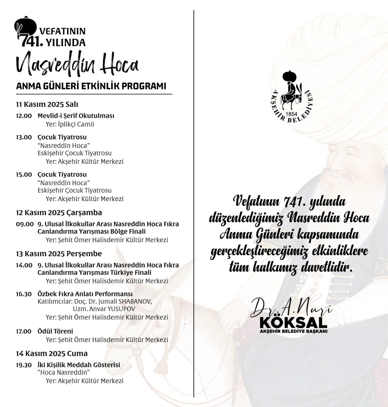 Anma programı, 14 Kasım Cuma günü saat 19.30’da Akşehir Kültür Merkezi’nde sahnelenecek “Hoca Nasreddin” adlı iki kişilik meddah gösterisiyle sona erecek. Gösteri, Selçuk Üniversitesi Devlet Konservatuvarı öğretim üyeleri Mehmet Baltacan ve Hüseyin Şen tarafından sanatseverlerin beğenisine sunulacak.