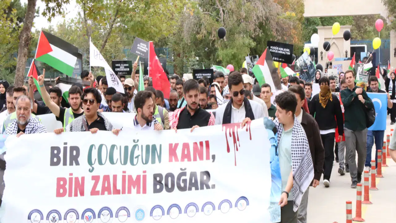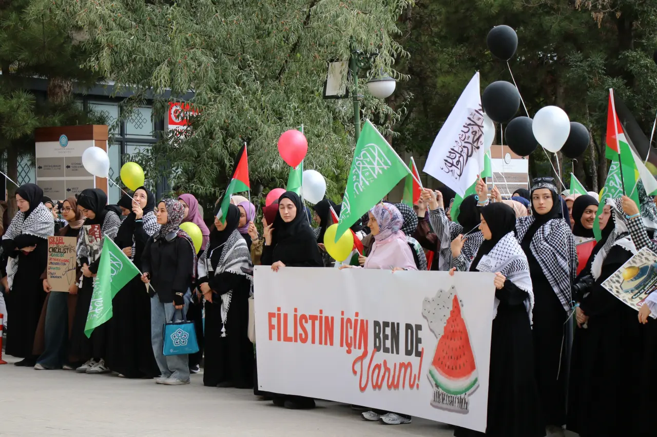 Öğrenci toplulukları sözcüsü Ahmet Talha Koçak ise, “Bugün Filistin’de, Gazze’de, nice masum çocuklar daha isimleri konulmadan, kulaklarına ezan bile okunmadan toprağa veriliyor. Biz bu derdi taşımazsak, soykırımcılara karşı nasıl bir cevap verebiliriz. İşte bu şuurla bugün buradayız. 7 Ekim Aksa Tufanı’nın yıldönümünde Sumud Filosu gibi nice diriliş hareketlerini destek amacıyla bir araya geldik. Hem bir anma hem bir direniş hatırlatması olsun istiyoruz. Çünkü biliyoruz ki ümmet olursak sesimiz daha gür çıkar, adaletin sesi daha uzaklara ulaşır. Rabbim birlik ve beraberliğimizi daim eylesin” diye konuştu.