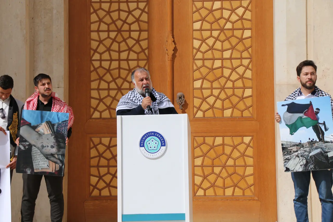 Konuşmasına, “Bugün burada sadece bir coğrafyadan, bir şehirden bahsetmiyoruz. Gazze dediğimizde; sabrı, direnişi, zulme karşı onurlu bir duruşu, açlığa, yoksulluğa ve kuşatmaya rağmen dimdik ayakta kalan bir halkı anıyoruz” sözleri ile başlayan Prof. Dr. Kamil Güneş, “Gazze, sadece Filistin halkının değil, ümmetin kalbidir. Gazze, insanlığın vicdanıdır. Orada çocuklar en temel haklardan mahrum büyüyor. Bir bardak suya, bir lokma ekmeğe, bir damla ilaca muhtaç bırakılıyor. Bombaların gölgesinde oynayan çocukların gözleri, “Biz hangi günahın bedelini ödüyoruz?” diye hesap soruyor. Gazze’de yıkılan evler sadece taş duvarlar değildir; bir milletin yüzyıllık hayalleri, duaları, umutlarıdır. Ama ne var ki, her yıkılan evin enkazından yeni bir direniş filizleniyor. Gazze’nin insanları, bizlere “Biz ölümü göze aldık ama onurumuzu vermedik” diye haykırıyor. Bugün Gazze için sesimizi yükseltmek, sadece bir dayanışma değil, insan olmanın gereğidir. Zulme karşı susmak, zalimin yanında yer almaktır. Gazze’ye sessiz kalmak, sadece Filistin’e değil, insanlığın özüne ihanettir. Bizim dualarımız, yardımlarımız, desteğimiz Gazze’nin nefesi olacaktır. Onlar, hiçbir imkâna sahip olmadan, imanı en büyük güç bilerek direniyorlar. Biz ise bu imanı yüreklerimize taşımalı, zulmün karşısında dimdik durmalıyız. Gazze düştüğünde sadece Filistin kaybetmez; Gazze yaşadığında sadece Filistin değil, insanlık kazanır” dedi.