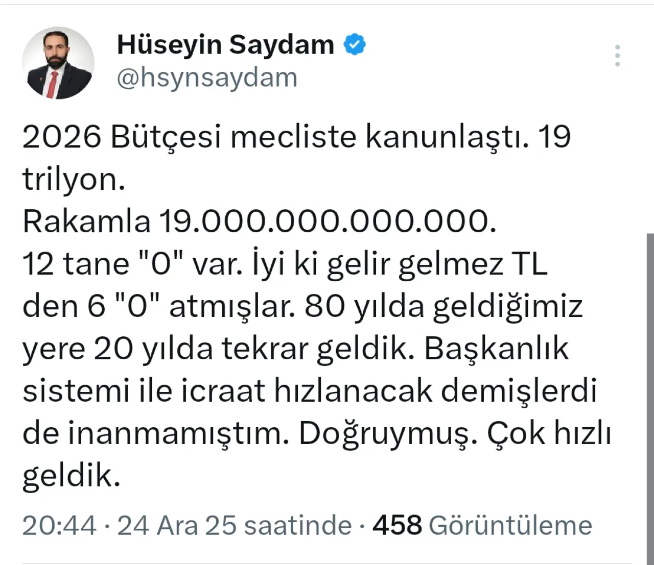 2026 bütçesinin 19 trilyon TL olarak yasalaştığını hatırlatan Saydam, rakamın büyüklüğüne dikkat çekerek, “Rakamla 19.000.000.000.000. Tam 12 tane sıfır var. İyi ki zamanında TL’den 6 sıfır atılmış” ifadelerini kullandı.