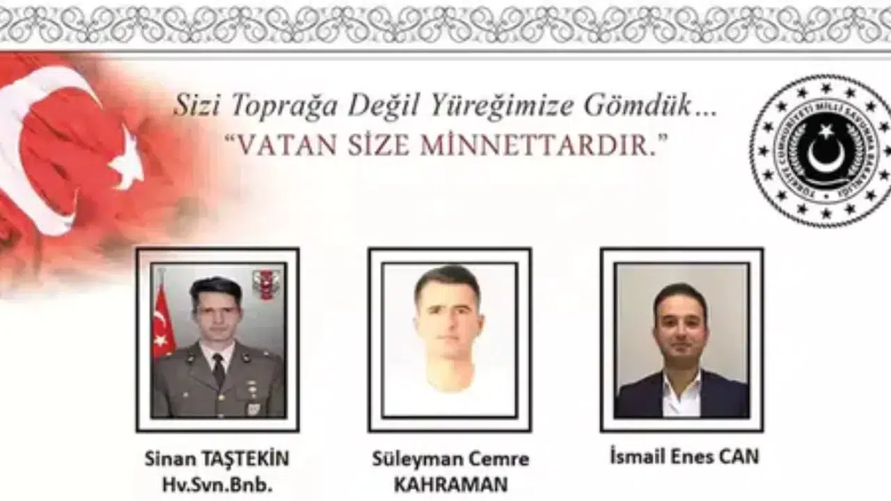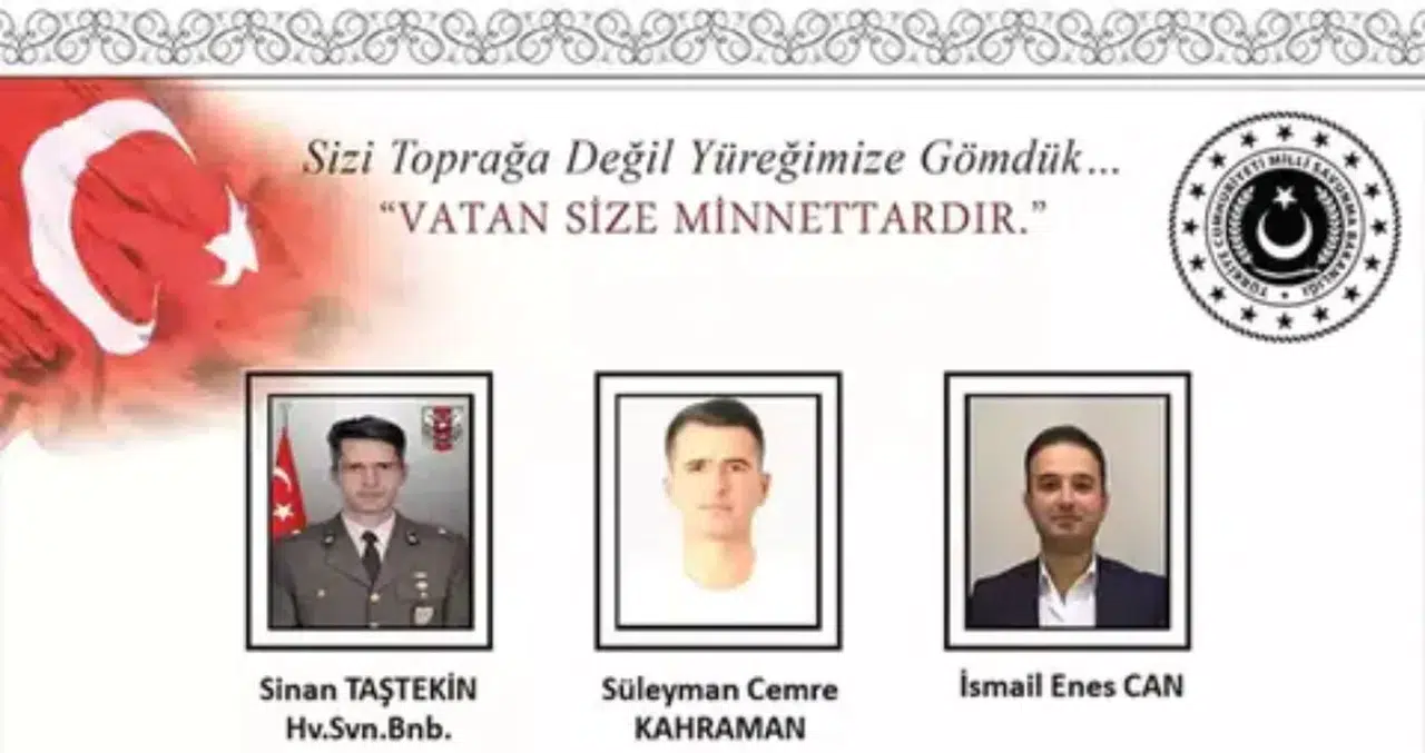 Yaşar Güler, şehit olan personelin isimlerini kamuoyuyla paylaştı. Buna göre, Hava Kuvvetleri Komutanlığı Hava Savunma Binbaşı Sinan Taştekin ile ASELSAN teknisyenleri Süleyman Cemre Kahraman ve İsmail Enes Can’ın şehit olduğu bildirildi.