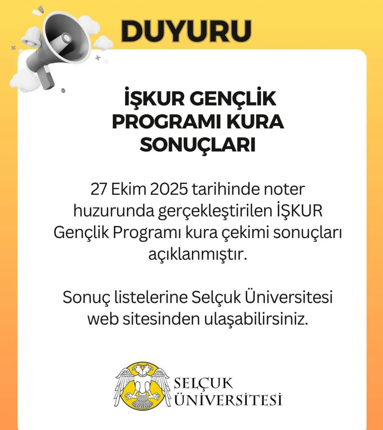 Selçuk Üniversitesi tarafından yürütülen İŞKUR Gençlik Programı kapsamında gerçekleştirilen kura çekimi sonuçları açıklandı.