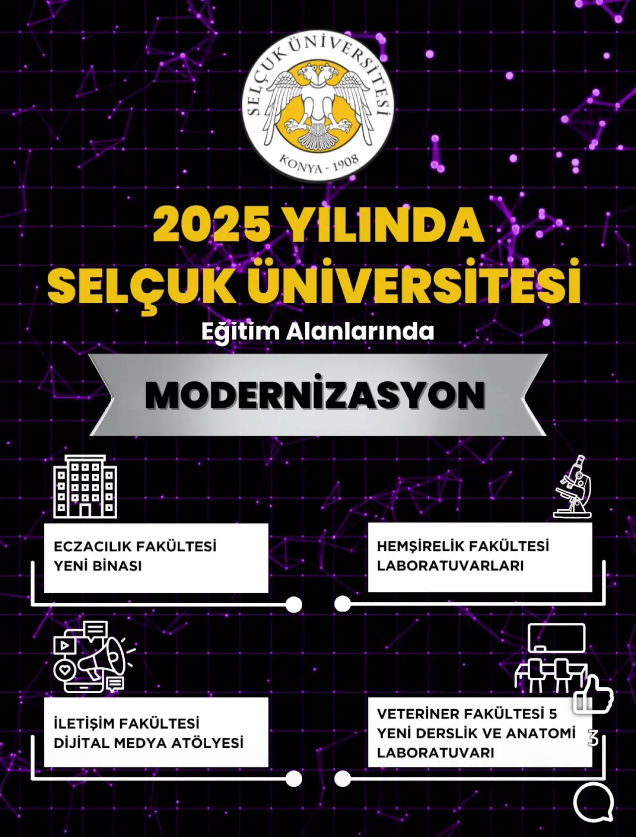 Selçuk Üniversitesi, 2025 yılı boyunca eğitim kalitesini ve kampüs yaşamını güçlendirmeye yönelik önemli modernizasyon çalışmalarına imza attı. Üniversite tarafından yapılan paylaşıma göre; eğitim alanlarında gerçekleştirilen yenilemeler ile altyapı ve ulaşım düzenlemeleri sayesinde kampüs genelinde daha nitelikli öğrenme ve yaşam ortamları oluşturuldu.