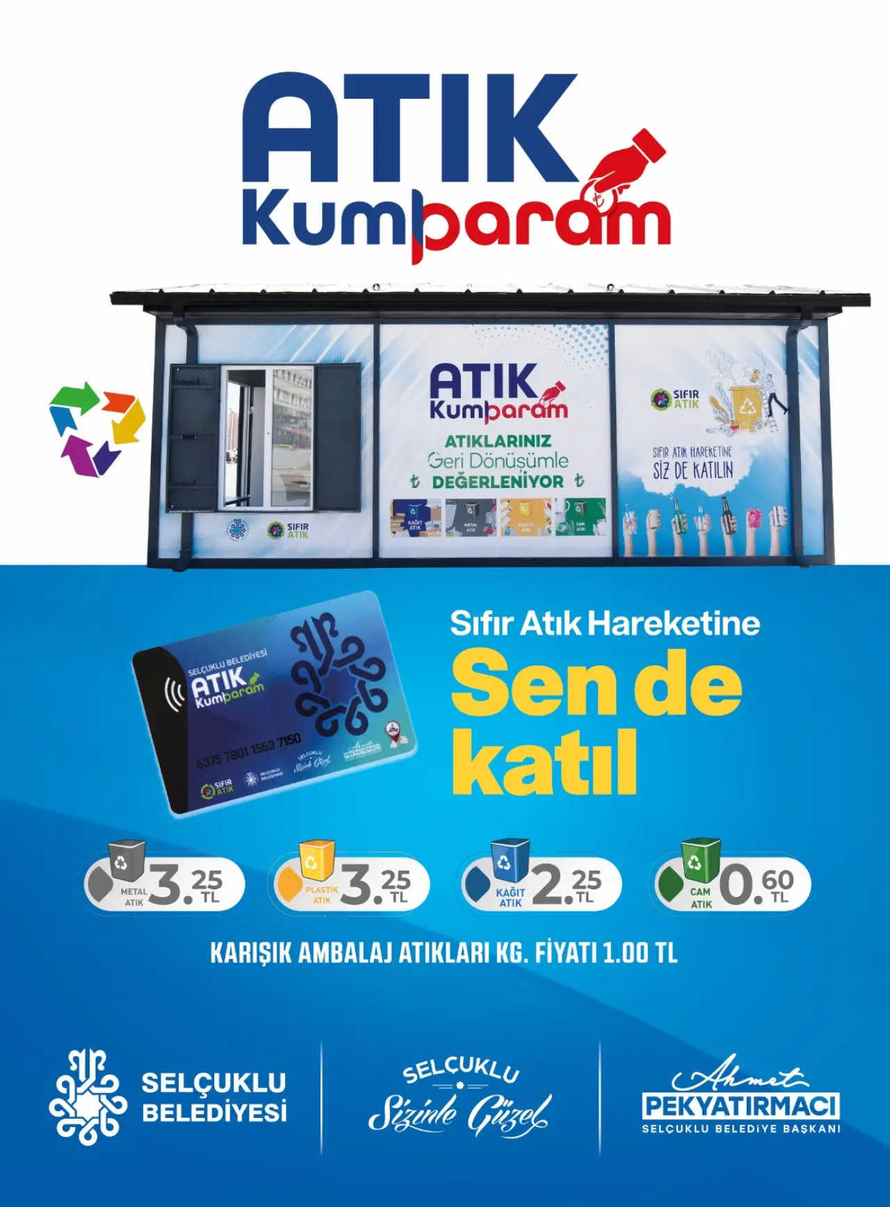 Selçuklu Belediyesi İklim Değişikliği ve Sıfır Atık Müdürlüğü tarafından hayata geçirilen 'Atık Kumbaram' projesi, çevre ve sıfır atık konularında farkındalığı arttırmak, geri dönüşüm kültürünü pekiştirmek ve Selçuklu halkının ev ekonomisine katkı sağlamak amacıyla hayata geçirilerek 2022 tarihinde vatandaşların kullanımına sunuldu. İlk günden itibaren aynı kararlılık ve titizlikle sürmeye devam eden proje kapsamında; plastik, cam, metal, kâğıt ve elektronik atıkların ayrı ayrı toplanmasına imkân sağlayan kumbaralar, çevre dostu yapısı ve kullanım kolaylığıyla dikkat çekiyor.