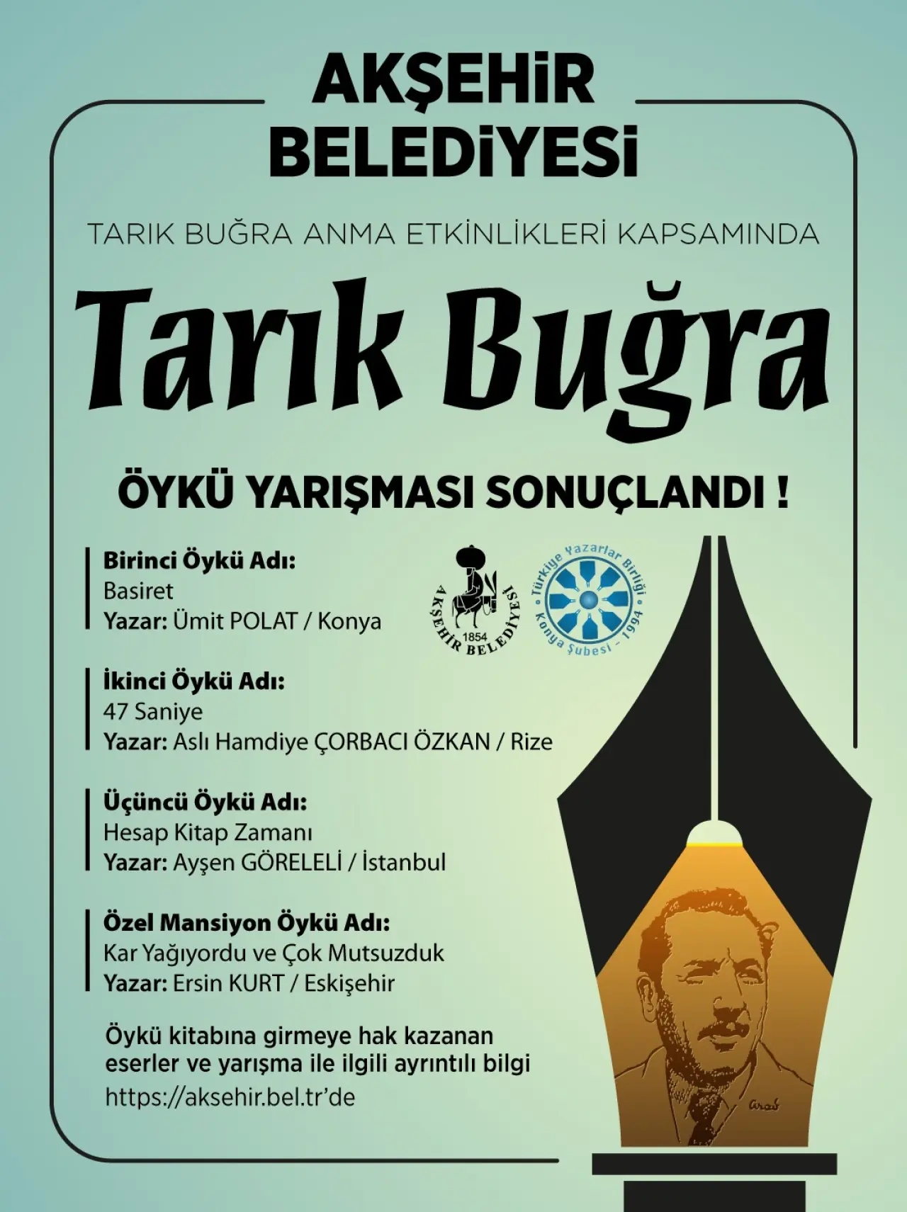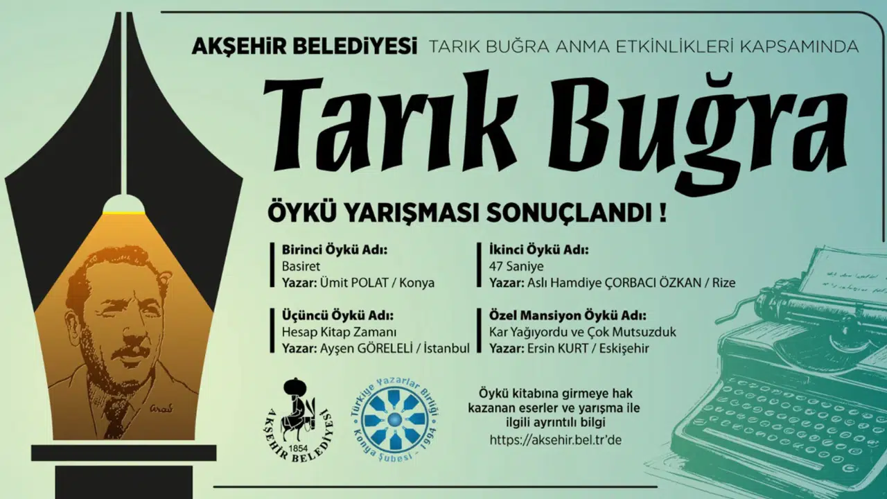 Akşehir Belediyesi’nin kültür ve sanat alanındaki çalışmalarına önemli katkı sunan Tarık Buğra Ulusal Öykü Yazma Yarışması, jüri değerlendirme sürecinin tamamlanmasıyla sonuçlandı. Yarışma, Türk edebiyatının usta kalemlerinden Tarık Buğra’nın edebî mirasını gelecek kuşaklara aktarmayı ve öykü alanında üretim yapan yazarları teşvik etmeyi hedefliyor.