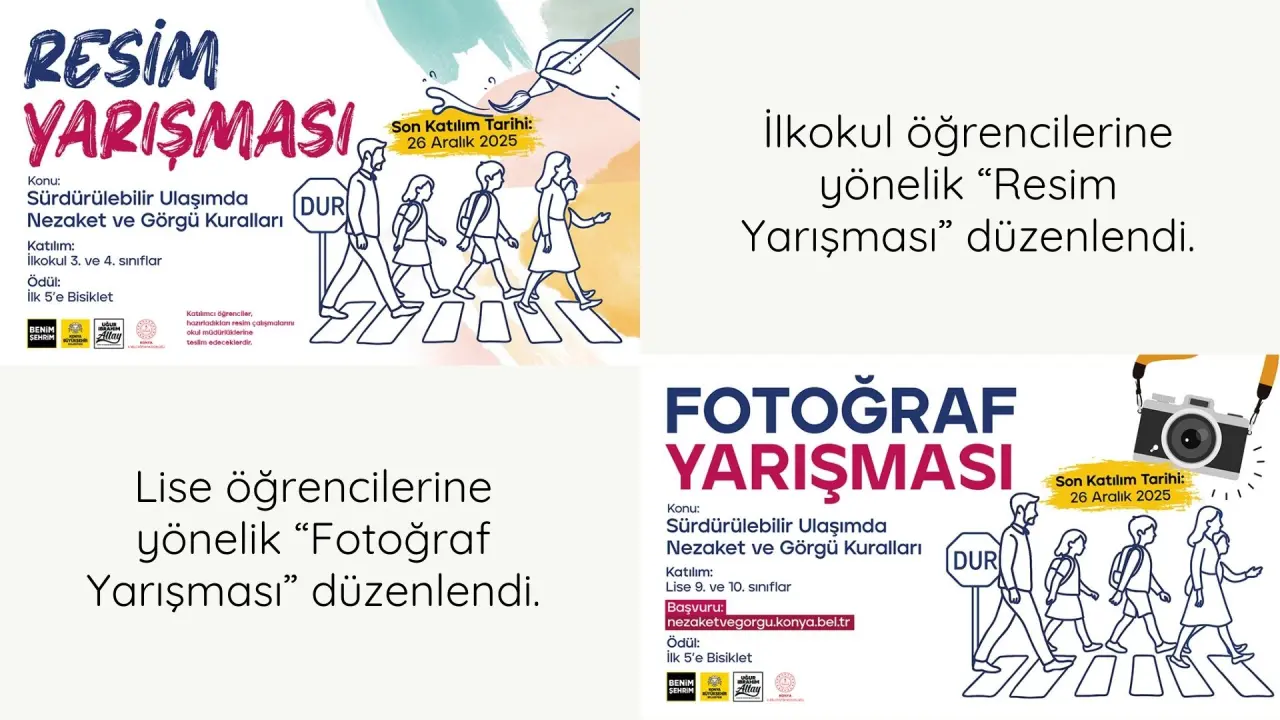 Bu kapsamda, Konya Büyükşehir Belediyesi ve Konya İl Emniyet Müdürlüğü iş birliğiyle çeşitli etkinlikler düzenlendi. Öğrencilerin farkındalığını artırmak amacıyla resim ve fotoğraf yarışmaları gerçekleştirildi, dereceye girenlere ödüller takdim edildi. Nezaket Otobüsü etkinliğiyle trafikte saygı ve hoşgörü mesajları sahaya taşındı. Ayrıca sürücü kurslarında sürücü adaylarına yönelik trafikte nezaket ve trafik adabı konularında eğitimler verildi.