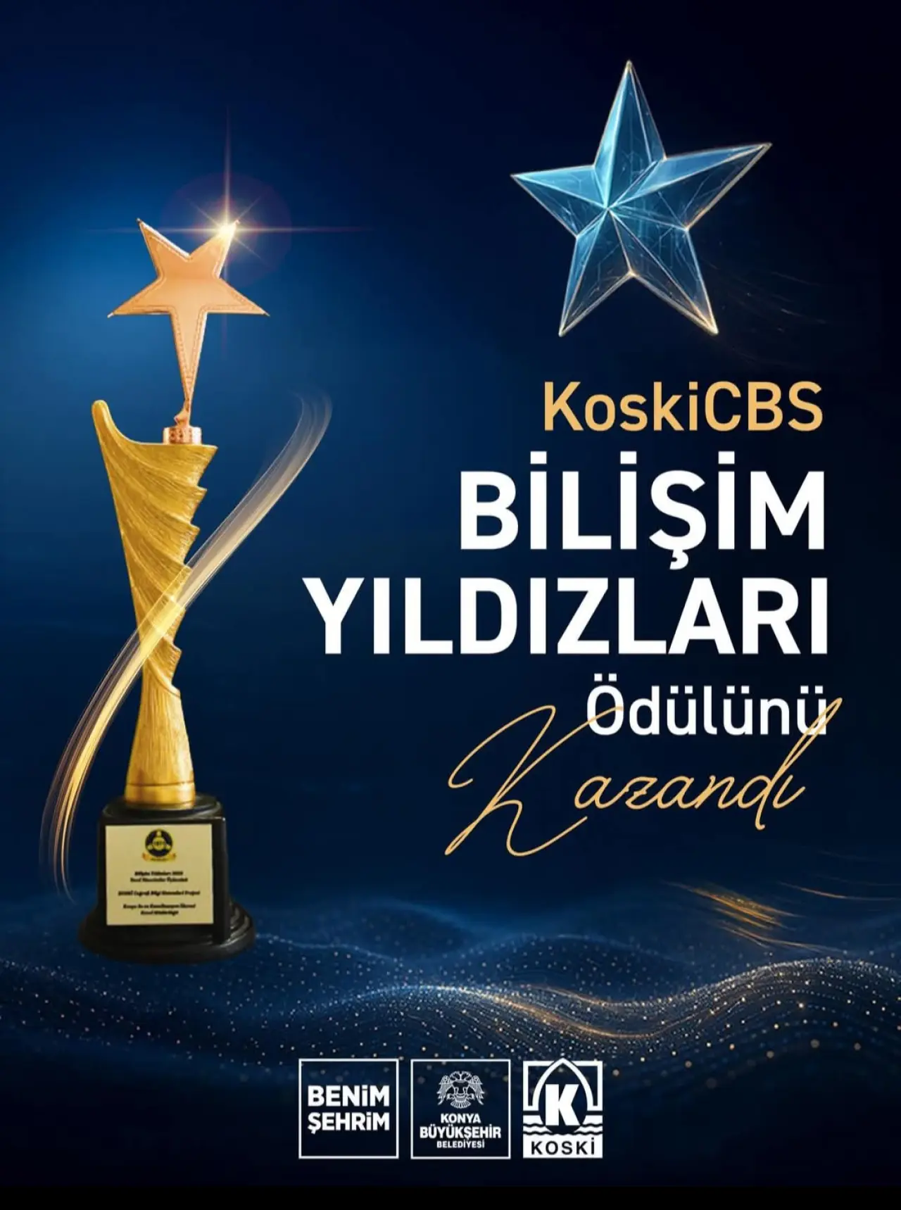 Konya Büyükşehir Belediyesi KOSKİ Genel Müdürlüğü’nün, Türkiye’nin en büyük su şebekesini dijital olarak yöneten ve tamamen yerli imkânlarla geliştirilen KoskiCBS Projesi, Türkiye Bilişim Derneği tarafından düzenlenen **“12. Bilişim Yıldızları 2025 Yerli ve Milli/Özgün Proje Ödülü”**ne layık görüldü.