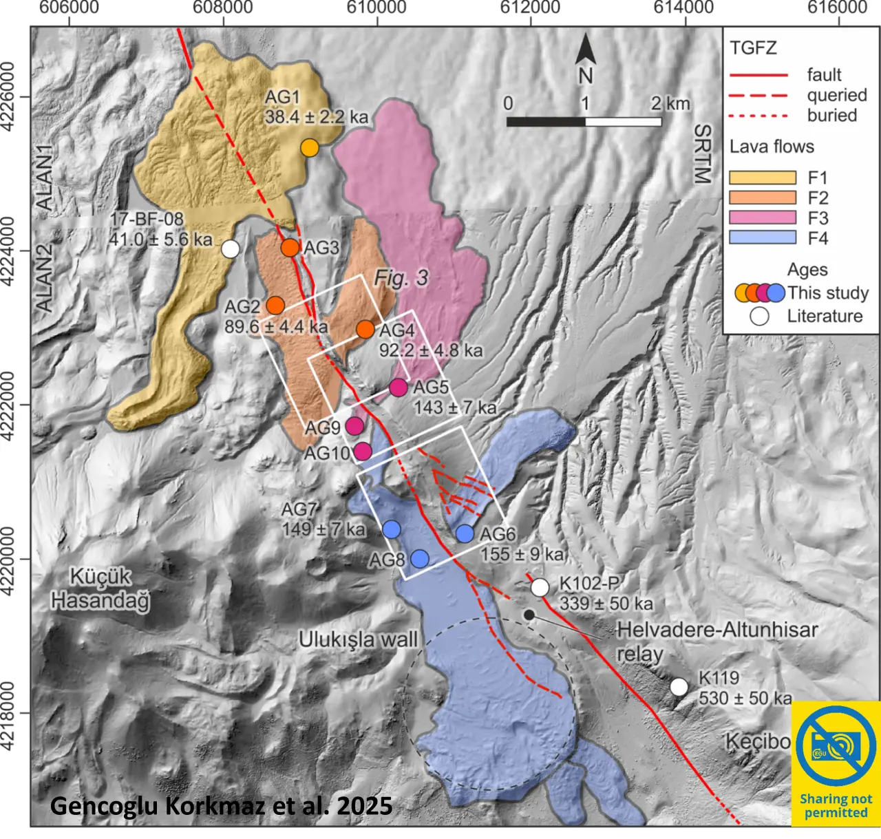 Konya Teknik Üniversitesi Mühendislik ve Doğa Bilimleri Fakültesi Jeoloji Mühendisliği Bölümünden Dr. Öğretim üyesi Gülin Gençoğlu Korkmaz’ın baş araştırmacı olarak yer aldığı çalışmada, literatürde ilk kez zirkon çift yaşlandırma (zircon double dating) tekniği fay yüzeylerine-fay ile kesilmis lavlara uygulanarak Tuz Gölü Fayı’nın geometrisi ve hareket tipi net biçimde belirlendi.