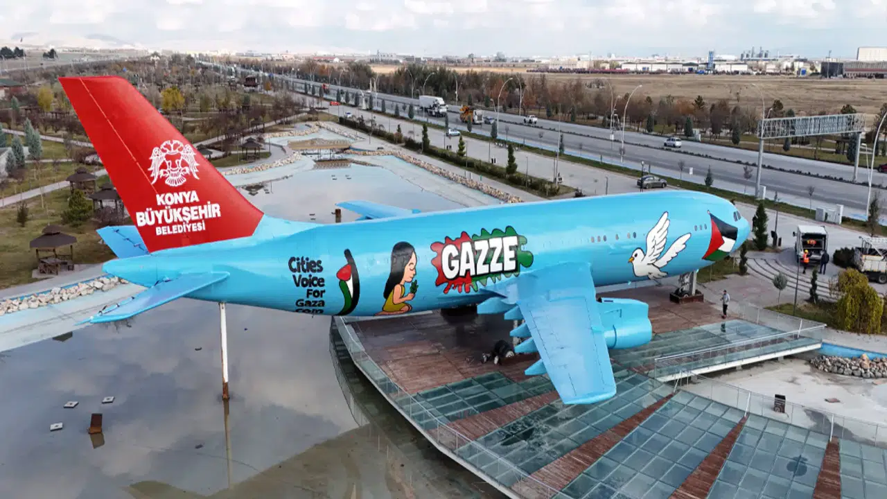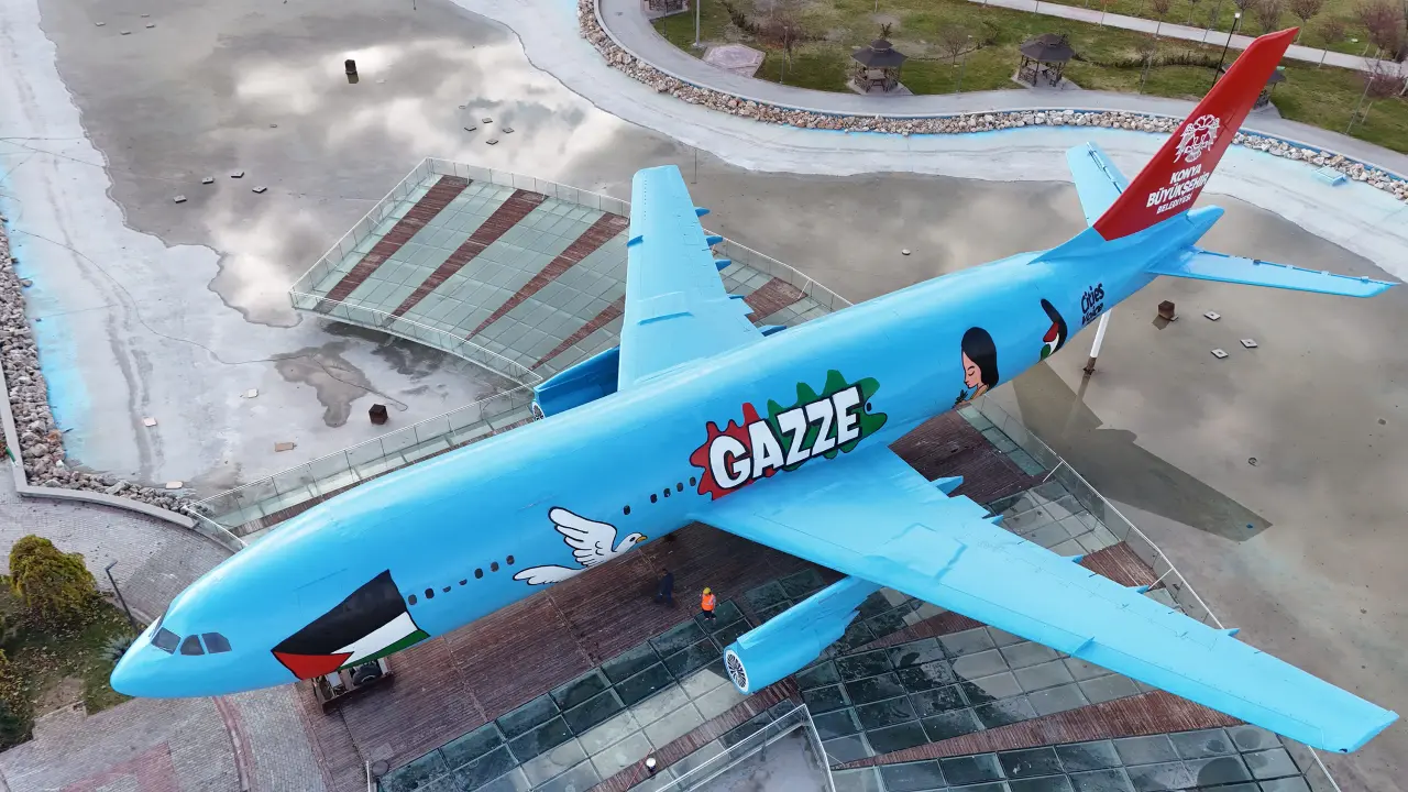 Konya Büyükşehir Belediyesi tarafından Ankara Yolu’ndaki Türk Yıldızları Parkı’nda sabit olarak bulunan, daha önce restoran olarak da kullanılan Airbus A300 tipi uçak, grafiti sanatıyla Gazze’ye destek veren bir esere dönüştürüldü.