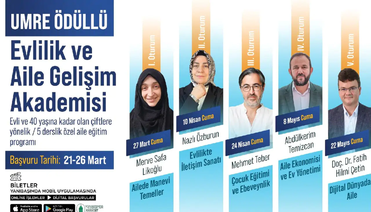 Evlilik ve Aile Gelişim Akademisi’nin ilk semineri 27 Mart günü saat 20.30’da Mevlana Kültür Merkezi’nde gerçekleştirilecek. Programın ilk konuğu yazar Merve Safa Likoğlu olacak. Likoğlu, “Ailede Manevi Temeller” başlığıyla katılımcılara eğitim verecek.