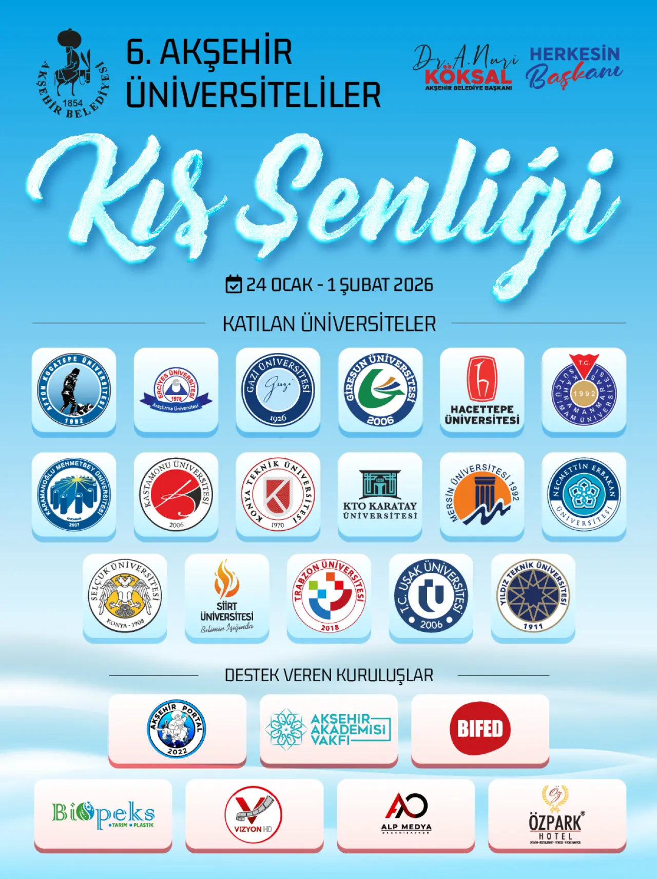 Akşehir Belediyesi, üniversite öğrencileri başta olmak üzere tüm gençleri ve Akşehirlileri, 6. Akşehir Üniversiteliler Kış Şenliğine davet ediyor.