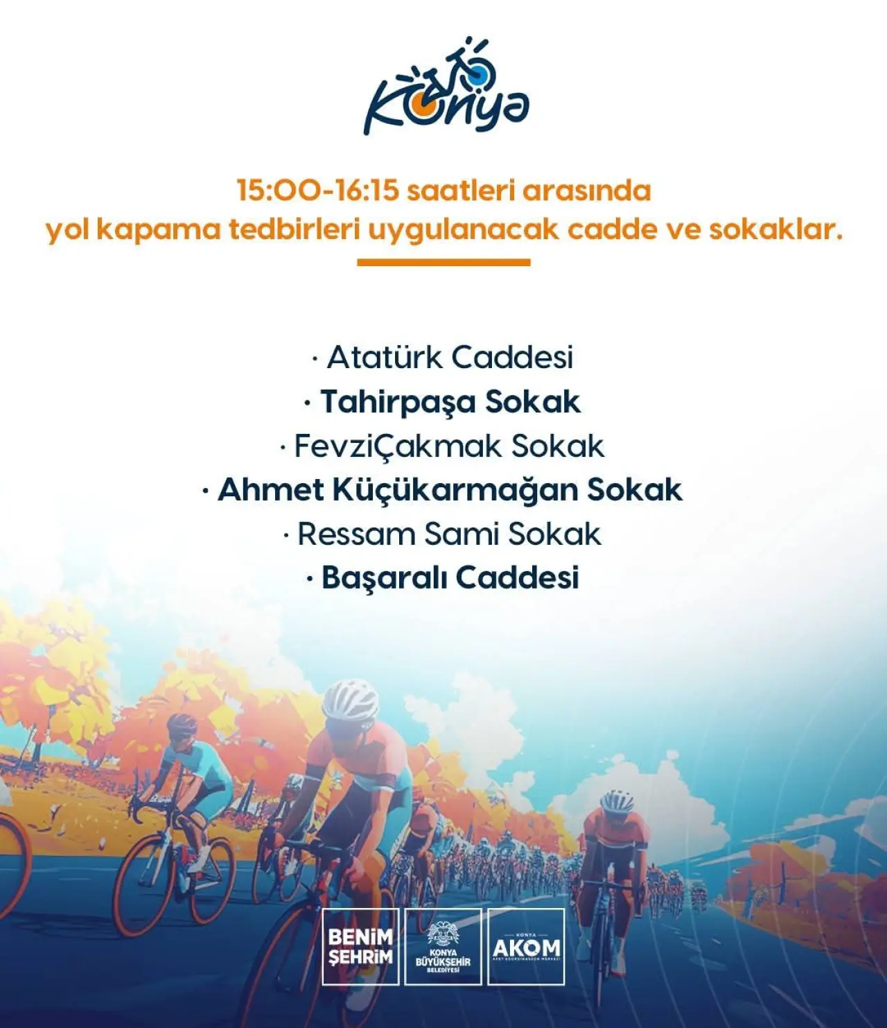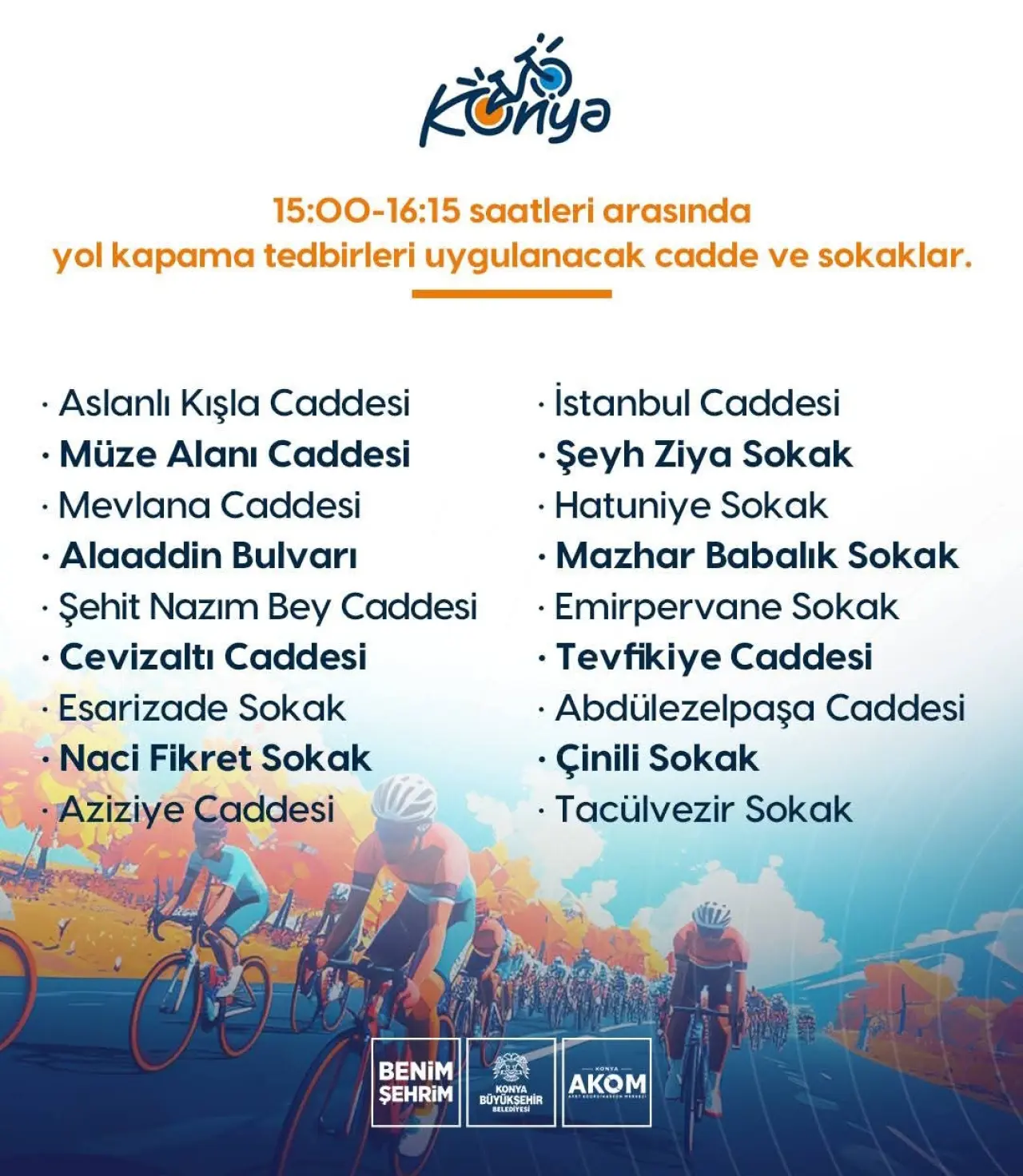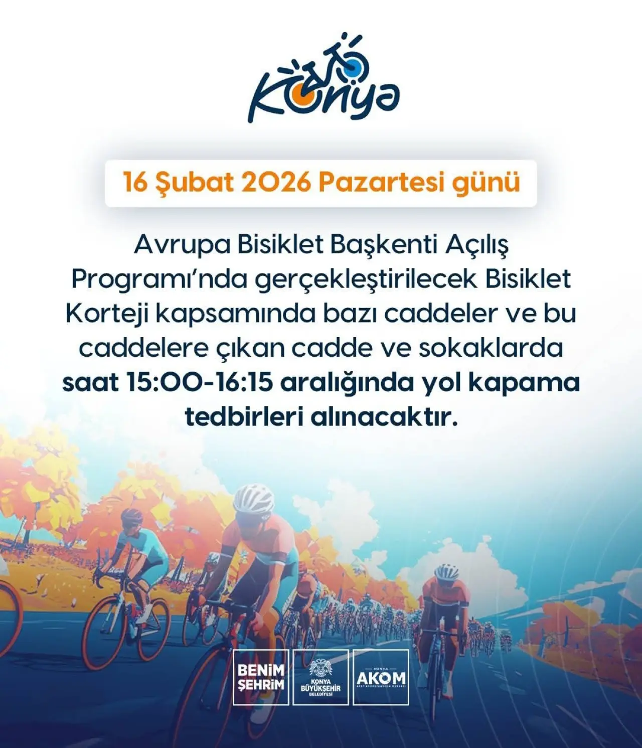 Konya AKOM, 16 Şubat Pazartesi günü düzenlenecek Avrupa Bisiklet Başkenti Açılış Programı kapsamında gerçekleştirilecek bisiklet korteji nedeniyle şehir merkezinde geçici yol kapatmaları uygulanacağını duyurdu.