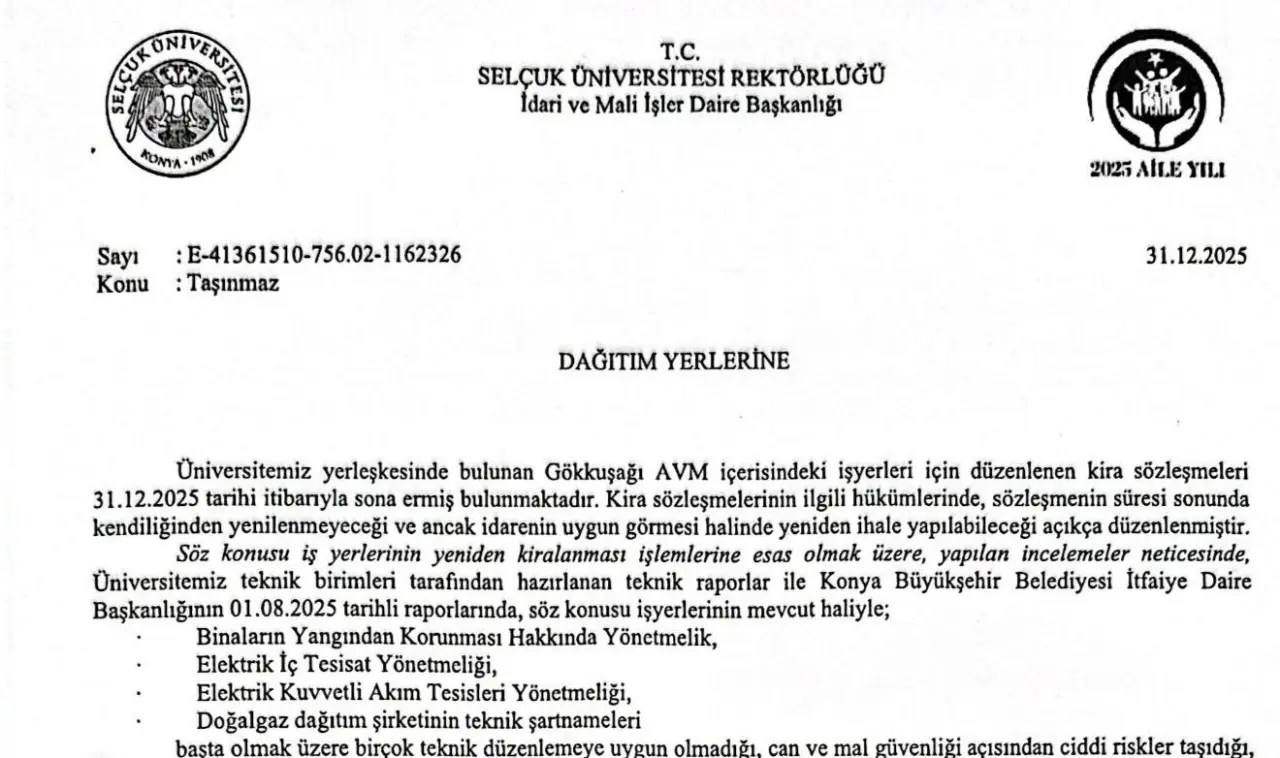Üniversite yönetimi bu tebligatta Gökkuşağı AVM içindeki iş yerlerinin 31.12.2025 tarihinde sona ereceği belirtildi.