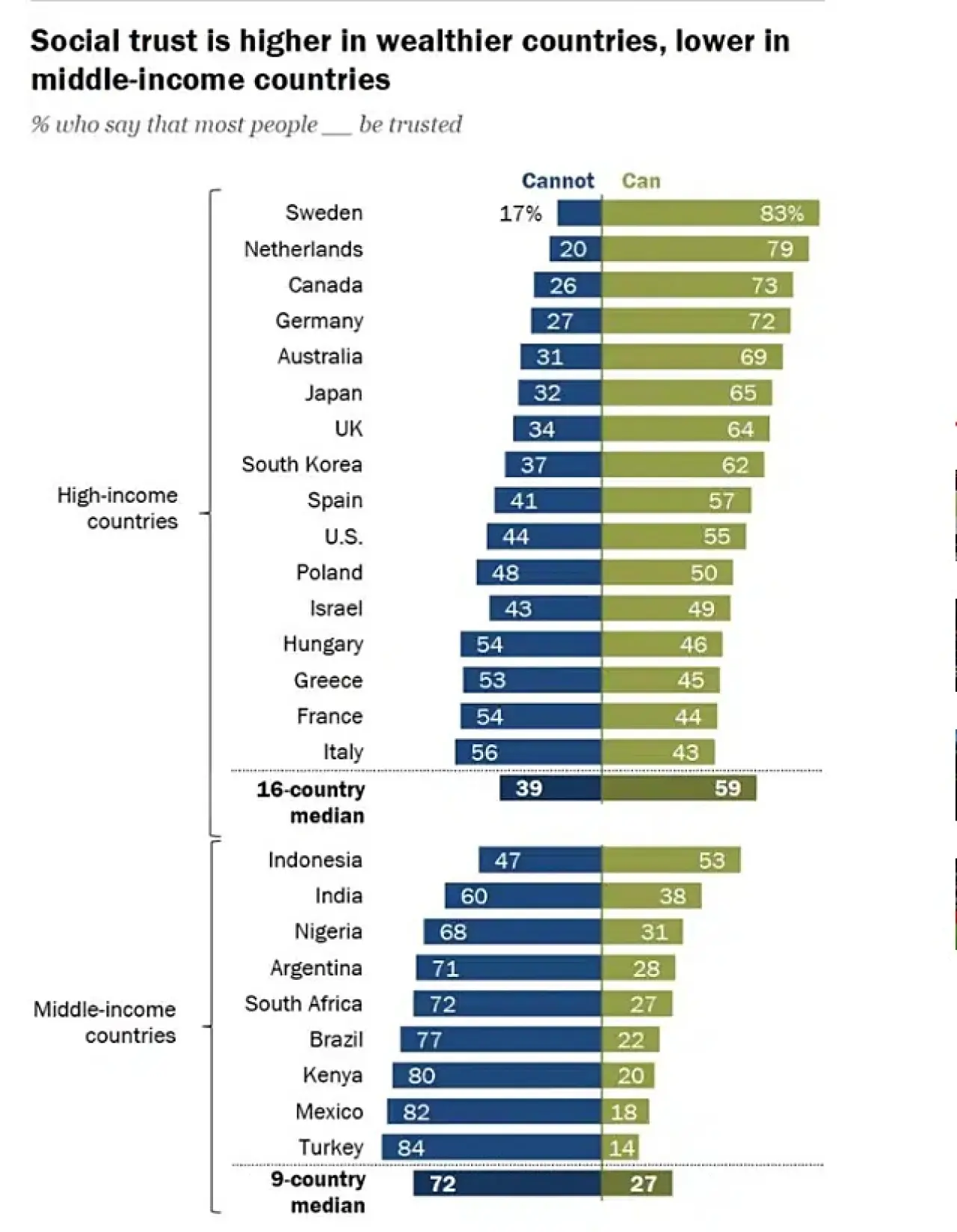 Araştırma sonuçları, yüksek gelirli ülkelerde sosyal güvenin belirgin biçimde daha yüksek, orta gelirli ülkelerde ise ciddi oranda düşük olduğunu gösterdi. Pew Research Center, çalışmayı “Sosyal güven zengin ülkelerde daha yüksek, orta gelirli ülkelerde daha düşüktür” başlığıyla yayımladı.