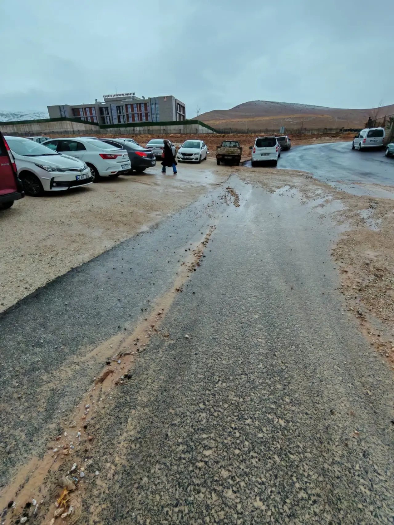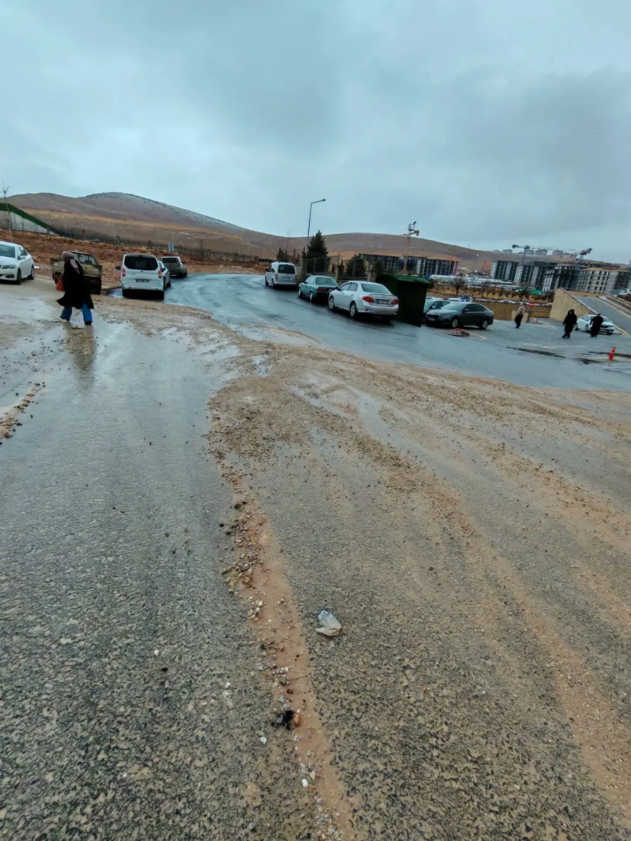 Buraya kaldırım veya bir bent yapılmadığı için üst taraftan akan yağmurla beraber taşlar olduğu gibi asfalta geliyor