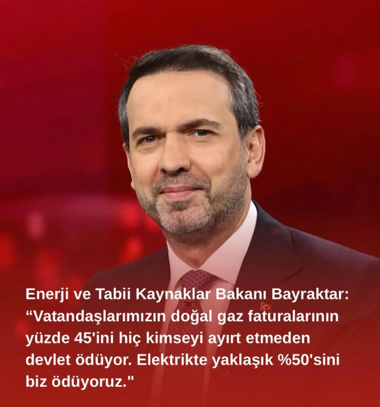 Enerji ve Tabii Kaynaklar Bakanı Alparslan Bayraktar, “Vatandaşlarımızın doğal gaz faturalarının yüzde 45’ini, hiç kimseyi ayırt etmeden devlet ödüyor. Size eğer 2 bin liralık fatura gelecekse, 1.100 lira doğal gaz faturası geliyor. Elektrikte yaklaşık yüzde 50’sini biz ödüyoruz.” dedi.