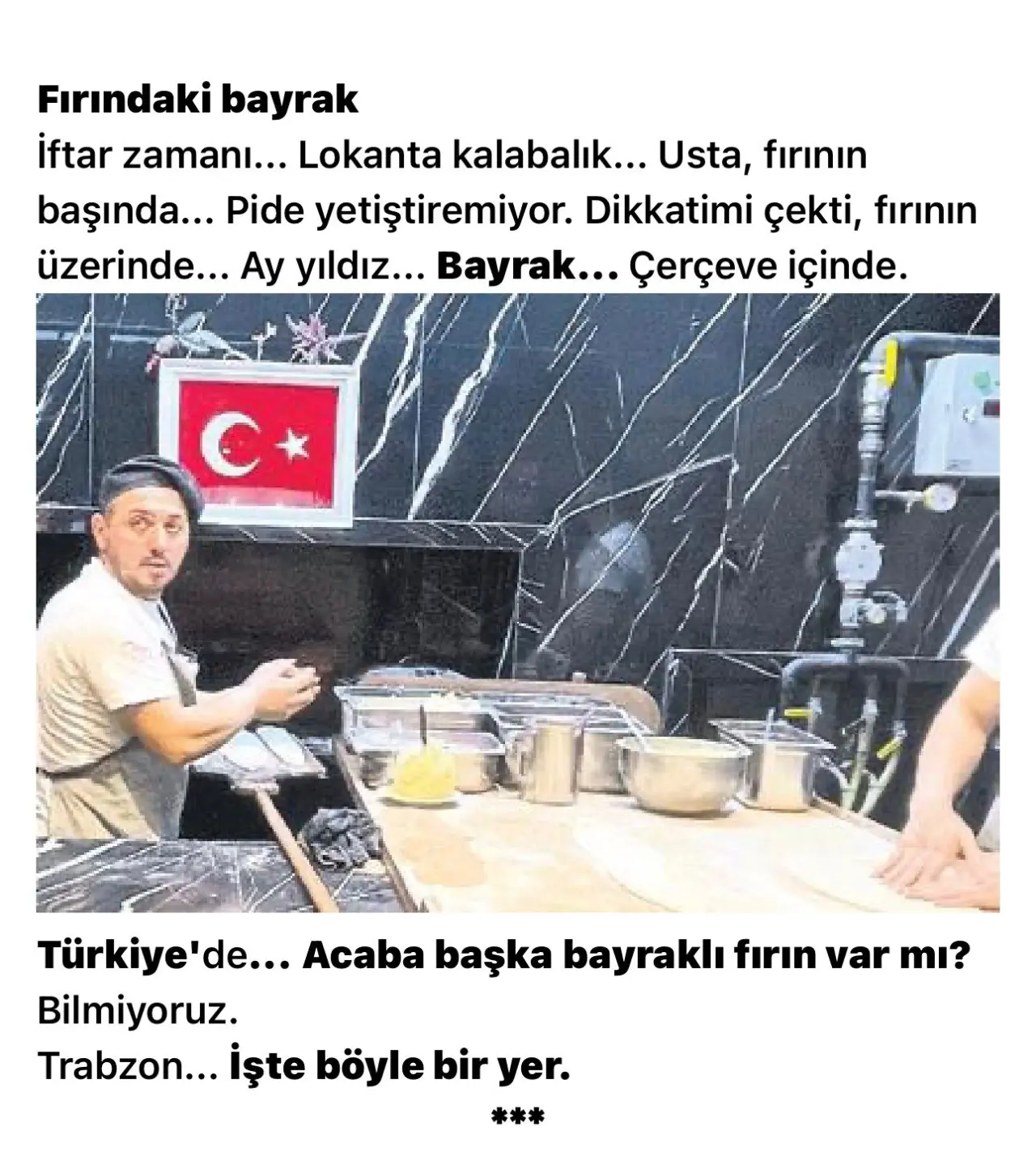 İftar zamanı... Lokanta kalabalık... Usta, fırının başında... Pide yetiştiremiyor. Dikkatimi çekti, fırının üzerinde... Ay yıldız... Bayrak... Çerçeve içinde