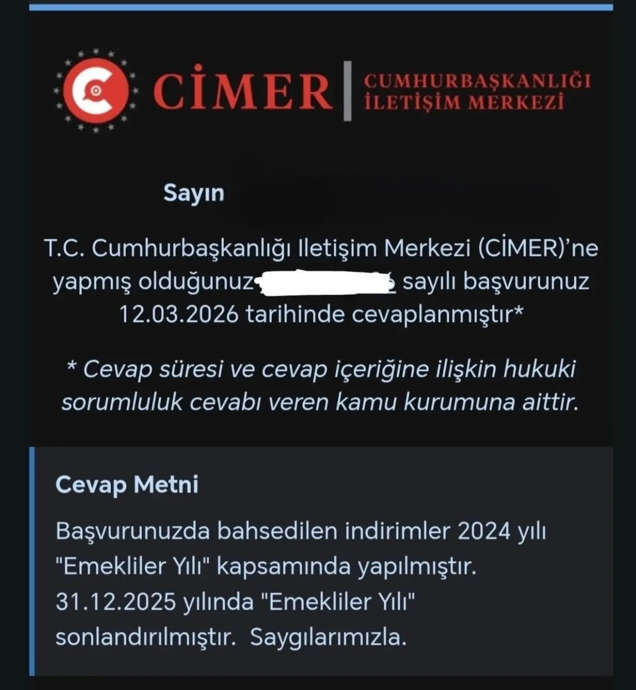 CİMER’den gelen şu cevap ile;