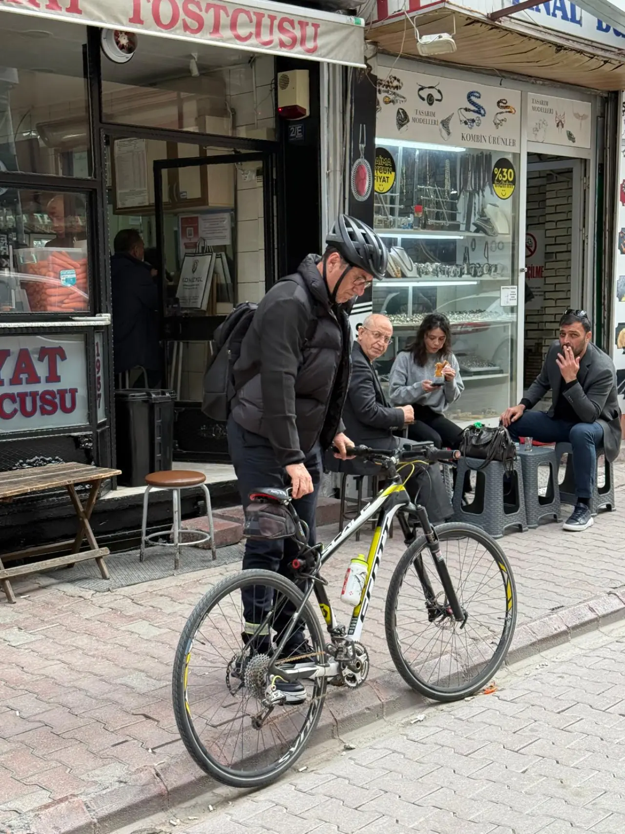 Şehrin markası, Türkiye’nin tanıdık bildik firması HAYAT TOSTÇUSU’NUN önünde bir bisikletçi bisikletini kaldırıma park etmeye çalışıyordu.