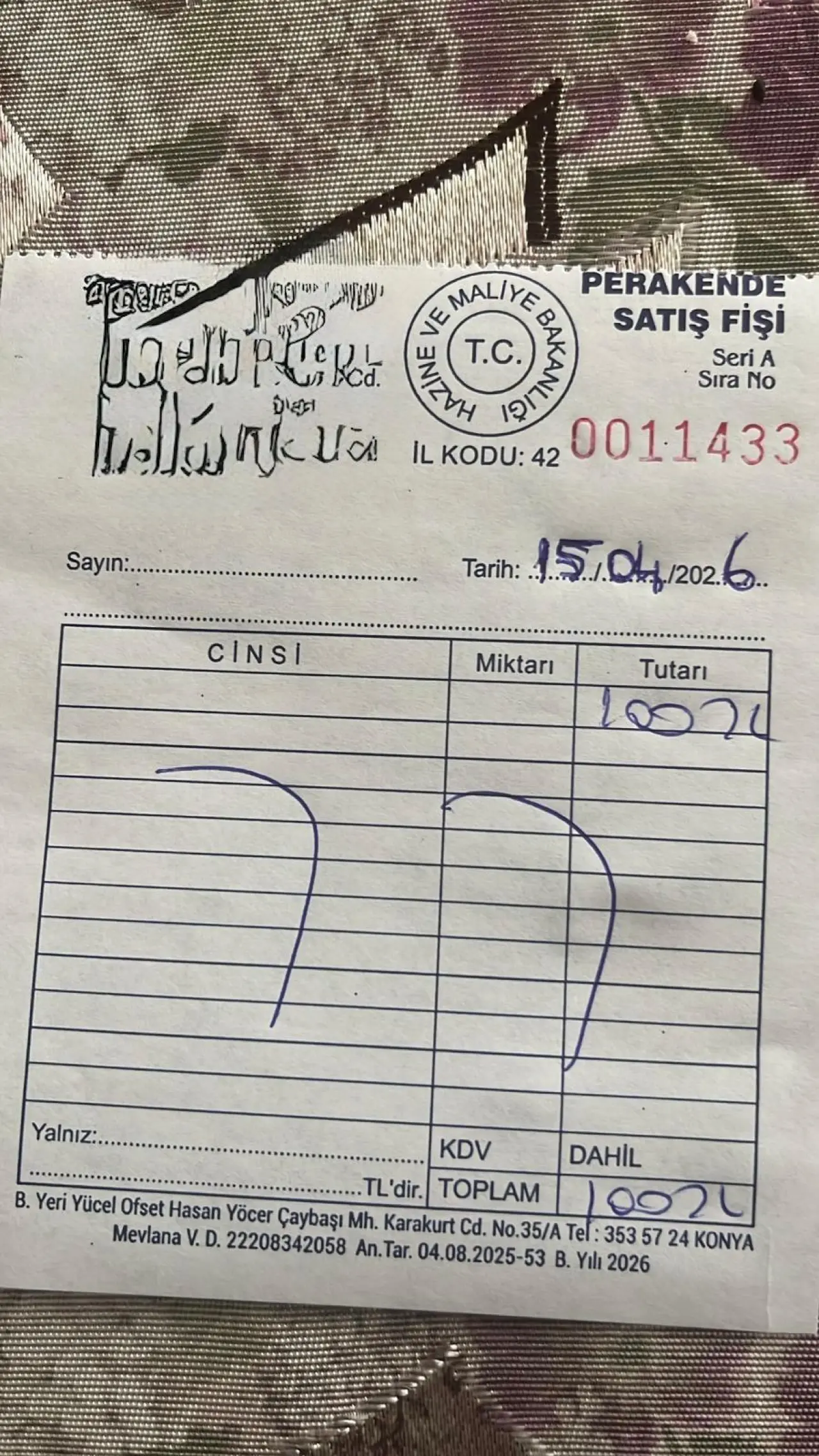 Faturada sahte değilse Mevlânâ Vergi Dairesi diyor, Konya merkezli olabilir.