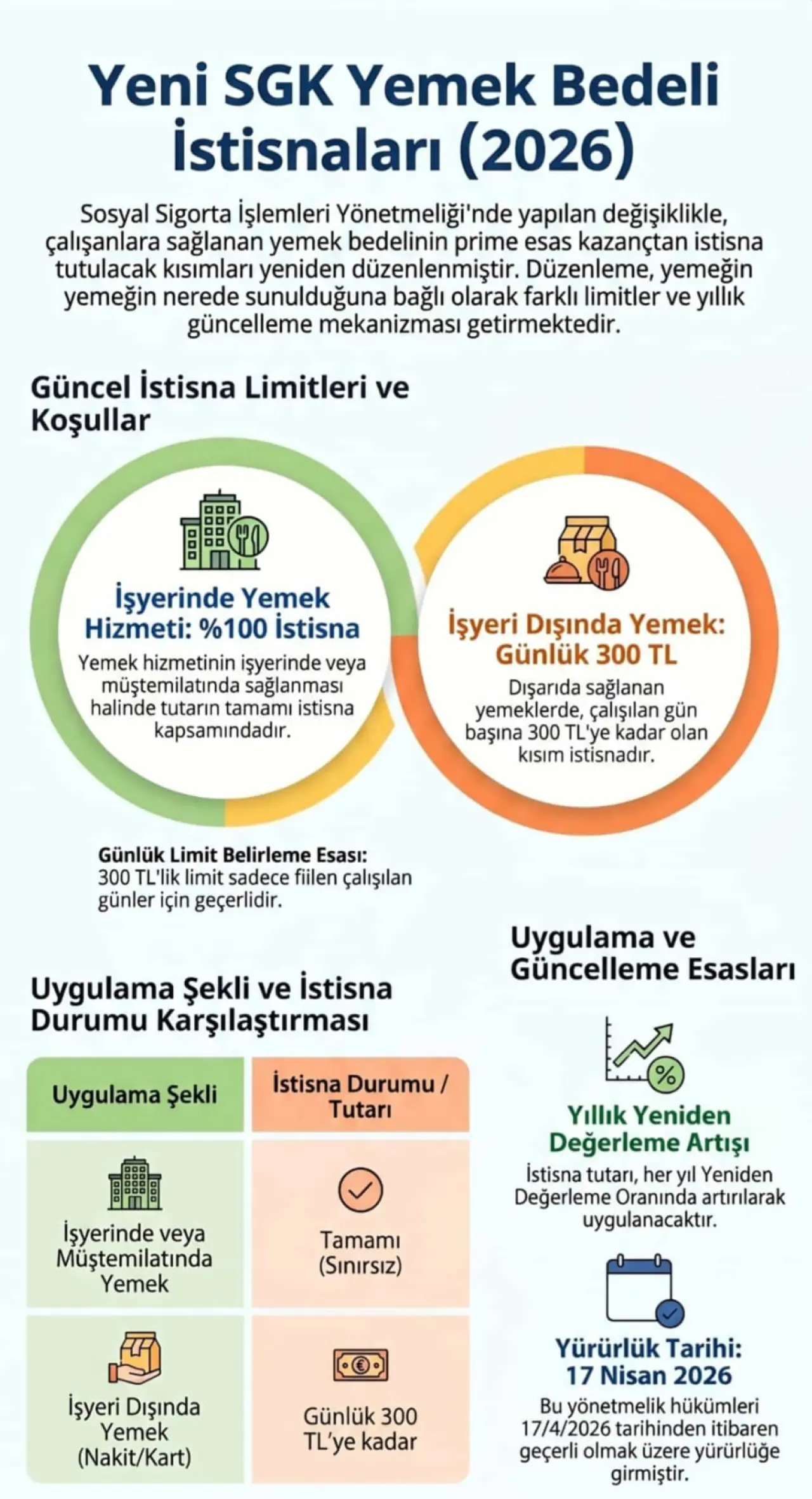 18 Nisan 2026 tarihli ve 33228 sayılı Resmî Gazete’de yayımlanan Sosyal Sigorta İşlemleri Yönetmeliği’nin 97nci maddesinde yapılan değişiklik sonucunda; çalışanlara sağlanan yemek bedelinin prime esas kazançtan istisna tutulacak kısımları yeniden düzenlenmiştir. Yeni düzenleme ile yemeğin sunulduğu yere bağlı olarak farklı limitler getirilmiştir.