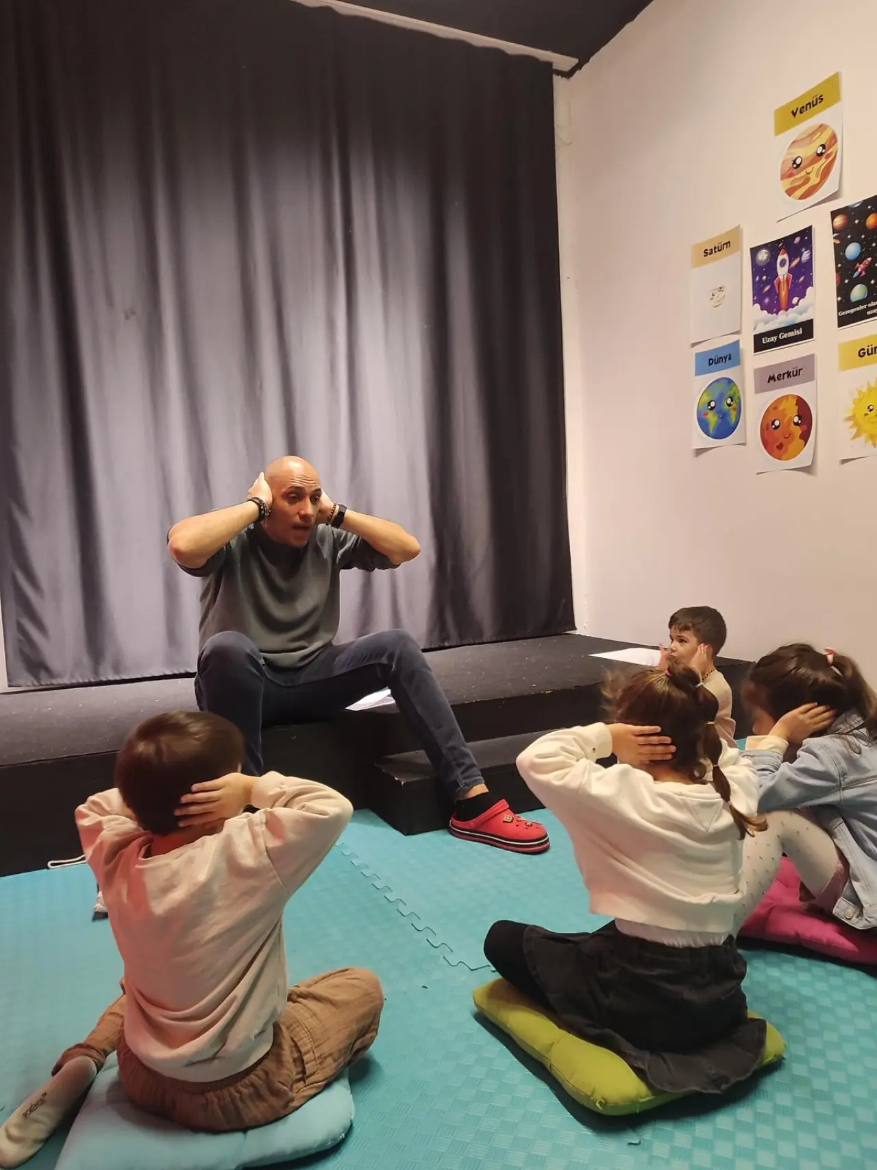 Eğlenceli ve öğretici etkinliklerle dolu atölye, katılımcılara hem bireysel hem de grup içinde aktif rol alma fırsatı sundu. Atölye süreci, çocukların zihinsel odaklanmalarını artırmayı ve hayal dünyalarını harekete geçirmeyi amaçlayan yönlendirilmiş imgelem çalışmalarıyla başladı. Isınma etkinliğinin ardından çocuklar, hayallerindeki astronot kostümlerini “giyerek” kendi uzay gemilerini birlikte inşa etti. Atölyenin ilerleyen bölümünde gezegenler keşfedildi.