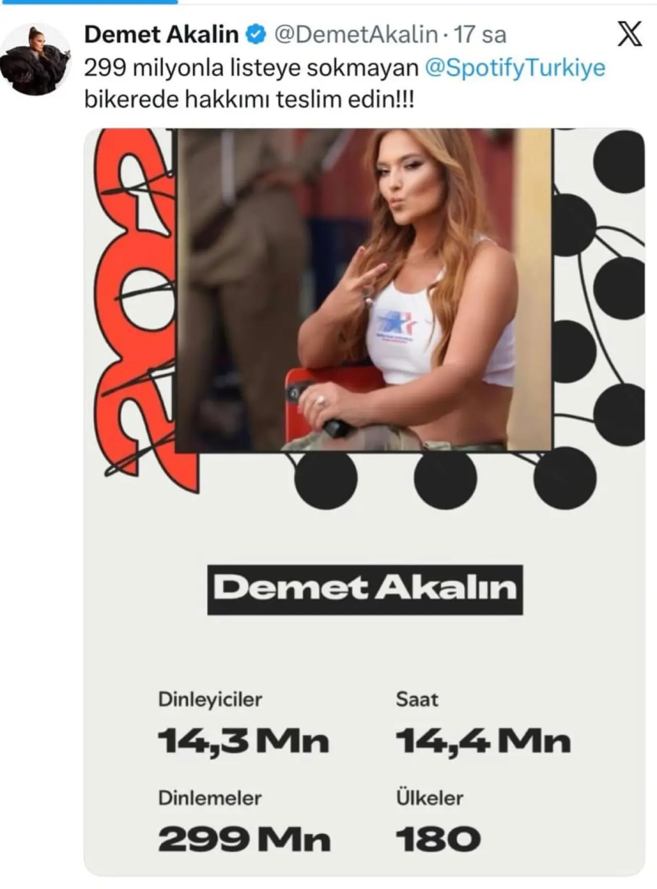 Spotify ,2025 yılında en çok dinlenen şarkılar ve en çok dinlenen sanatçılar listelerini açıkladı. Hem en çok dinlenen şarkılar da ve en çok dinlenen kadın sanatçılarda Demet Akalın’ın isminin olmaması Demet Akalın’ı sinirlendirdi.