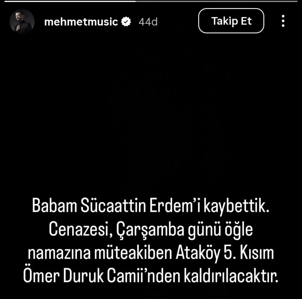 Şarkıcı Mehmet Erdem’den üzücü haber geldi. Mehmet Erdem babasının hayatını kaybettiğini açıkladı. Babasının cenazesi yarın öğlen gerçekleşecek.