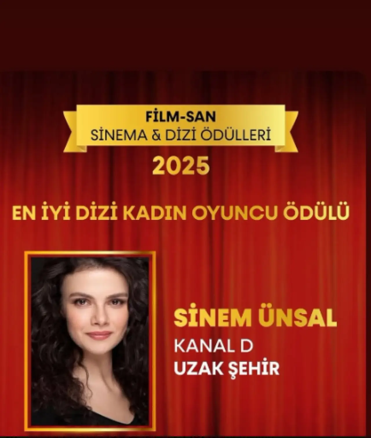 Uzak Şehir dizisinin sevilen başrollerinden Sinem Ünsal, gösterdiği başarılı oyuncuğuyla, Film-San Sinem Dizi ödüllerinde “Yılın En iyi Kadın Oyuncu” ödülünün sahibi oldu.
