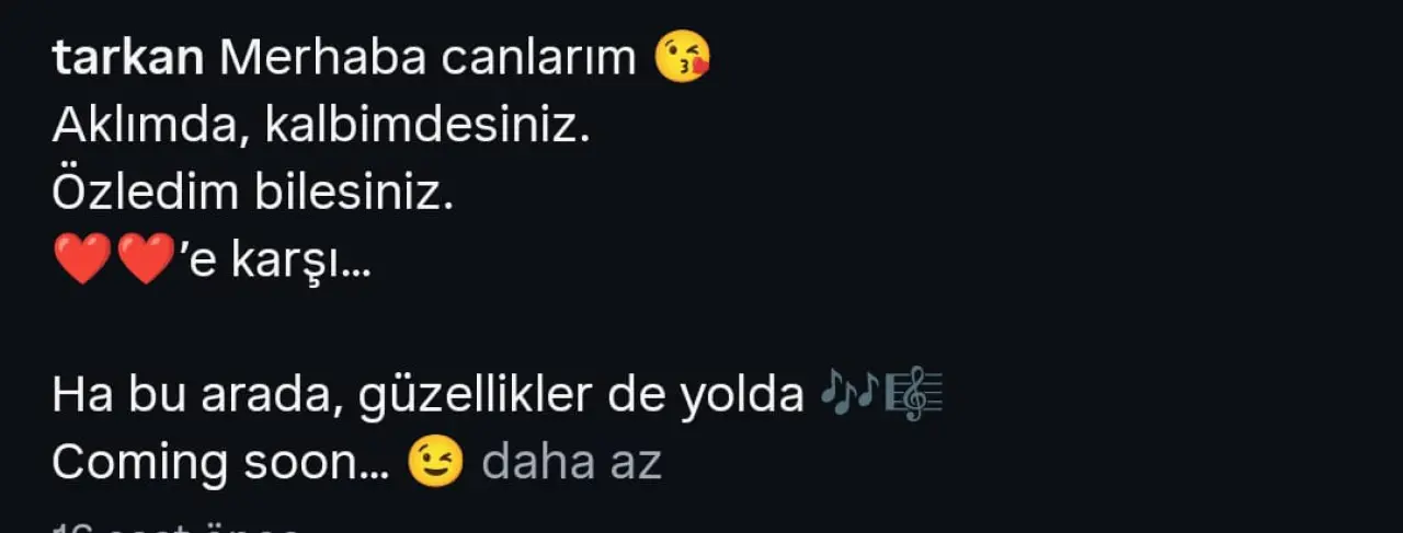Ünlü şarkıcı Tarkan’ın, hayranları şarkıcının uzun zamandır geri dönüş yapmasını bekliyorlardı. Tarkan, hayranlarına dün müjdeyi verdi. Yeni şarkı çıkaracağının müjdesini sosyal medya üzerinden paylaşarak duyurdu. Paylaşımında “ Ha bu arada ,güzellikler yolda ” diyerek paylaşım yaptı.