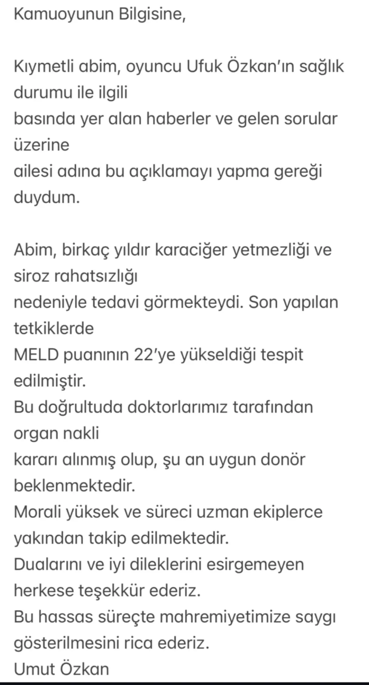 Ufuk Özkan’ın sağlığı ile ilgili açıklama kardeşi Umut Özkan’dan geldi.