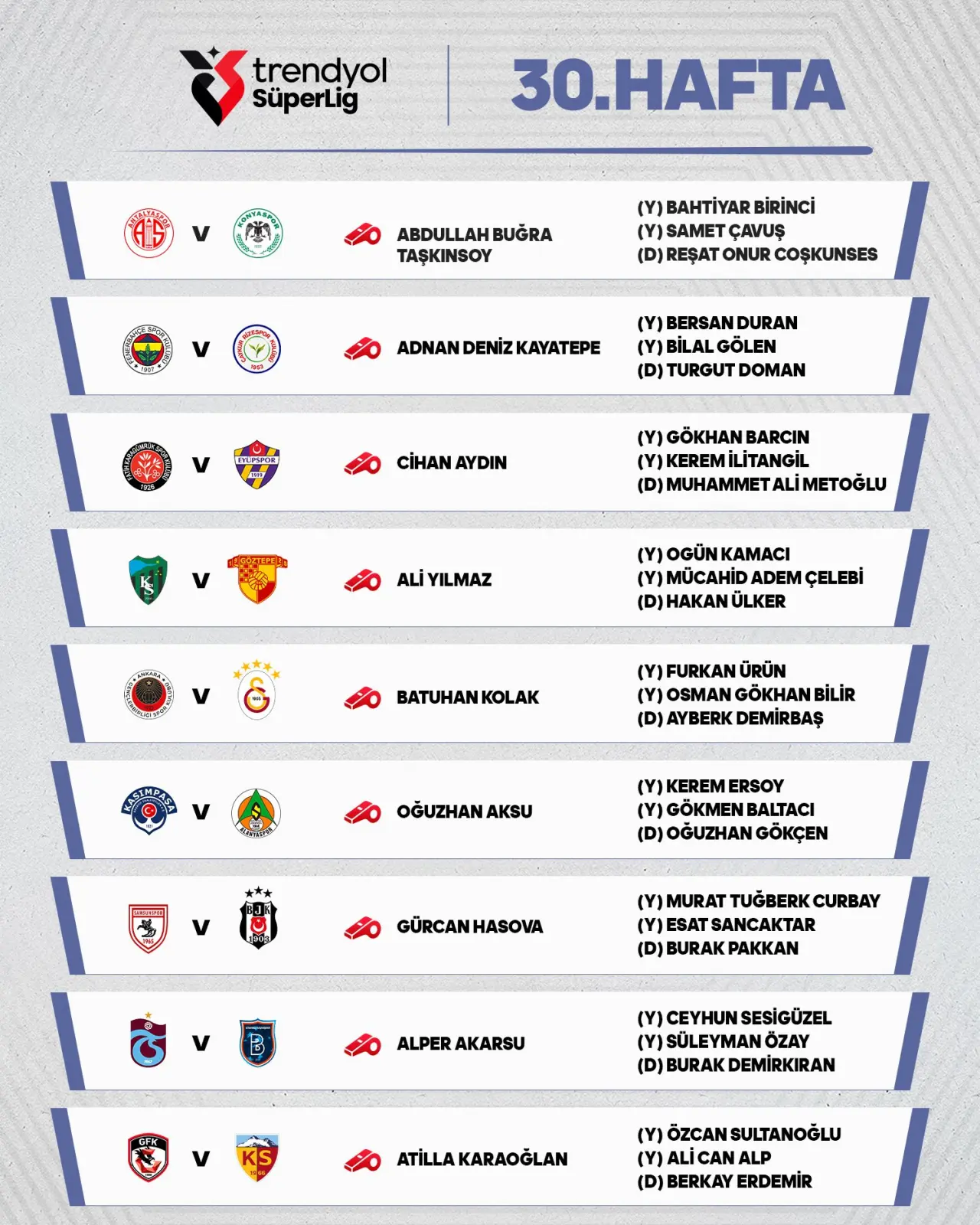 Haftada oynanacak hakemler ise şu şekilde;