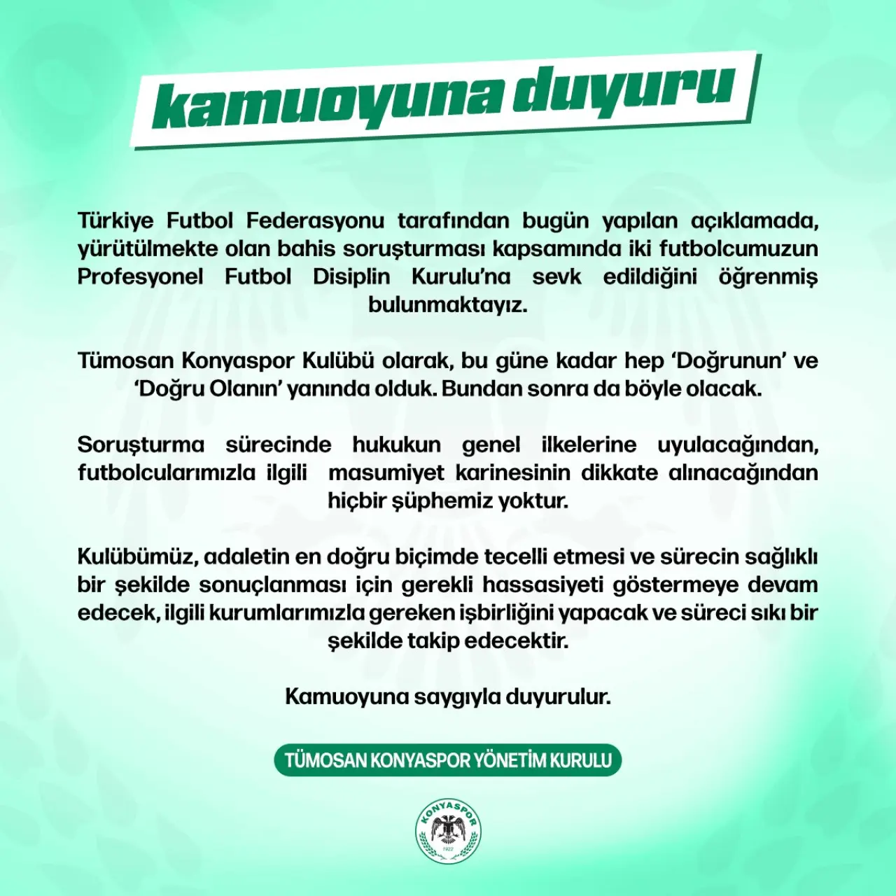 TÜMOSAN Konyaspor'da bahis skandalına ilişkin açıklama geldi. Kulüp sosyal medya hesabından yapılan açıklamada'' Türkiye Futbol Federasyonu tarafından bugün yapılan açıklamada, yürütülmekte olan bahis soruşturması kapsamında iki futbolcumuzun Profesyonel Futbol Disiplin Kurulu'na sevk edildiğini öğrenmiş bulunmaktayız.