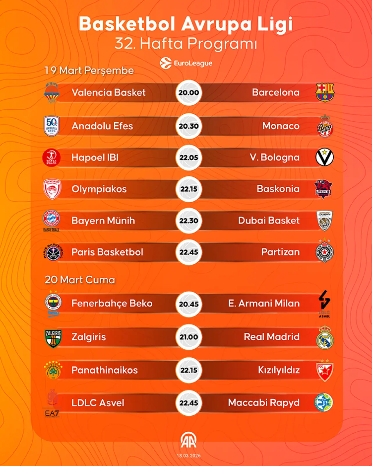 Avrupa basketbolunun kulüpler düzeyindeki bir numaralı organizasyonunda 32. hafta, yarın ve 20 Mart Cuma günü oynanacak müsabakalarla tamamlanacak.