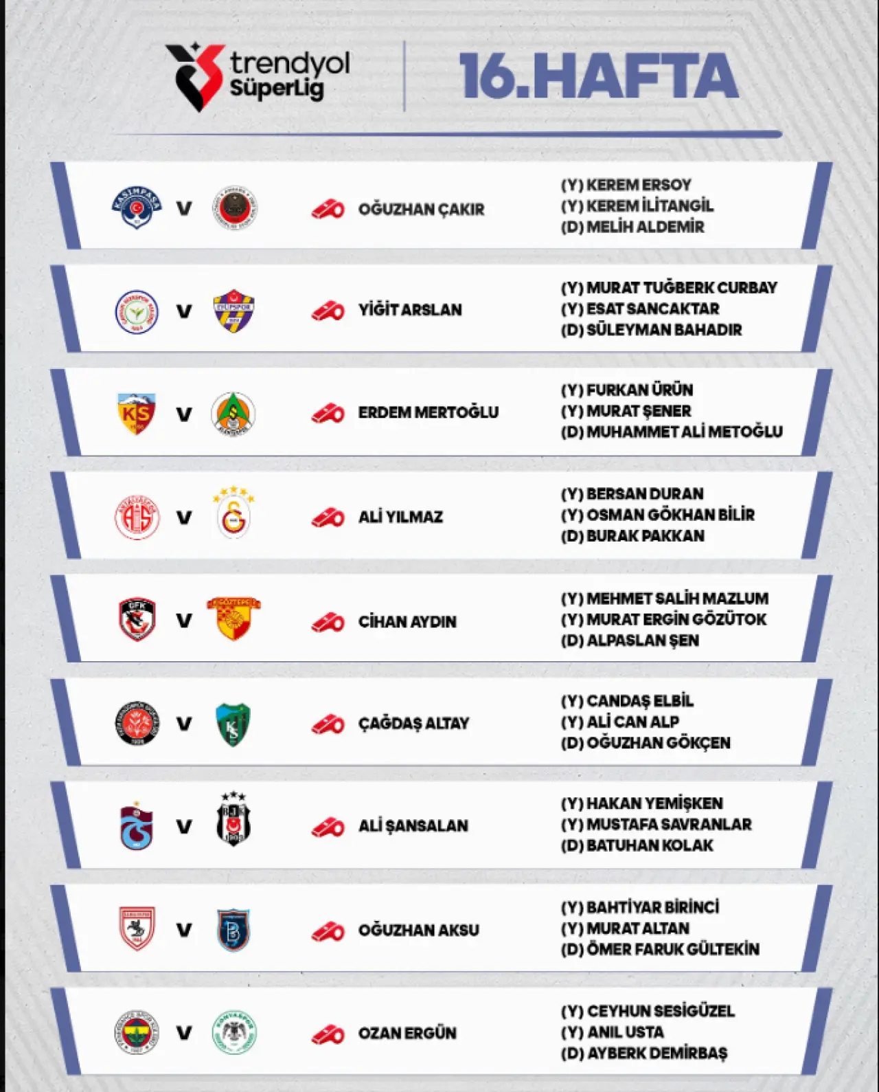 16. haftada oynanacak müsabakanın hakemleri şu şekilde;